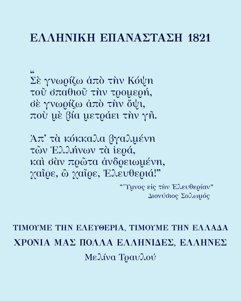 “Ο «Ύμνος εις την Ελευθερία», γεννημένος μέσα από την Ελληνική Επανάσταση του 1821, αποτελεί σύμβολο του πνεύματος και των αξιών του Ελληνισμού.