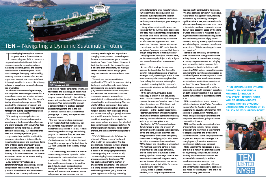 Το άρθρο αναφέρεται στον διαφοροποιημένο στόλο της TEN, τη μακροχρόνια εστίαση στην επιχειρησιακή πειθαρχία, το συνεχιζόμενο πρόγραμμα νέων πλοίων και την προσέγγιση εκσυγχρονισμού που στοχεύει στη βελτίωση της αποδοτικότητας και των περιβαλλοντικών επιδόσεων, ενώ παράλληλα σημειώνει την έμφαση της εταιρείας στη ναυτική τέχνη και τη ναυτική εκπαίδευση, συμπεριλαμβανομένης της ναυτικής ακαδημίας και των επενδύσεων στην ανάπτυξη πληρωμάτων.