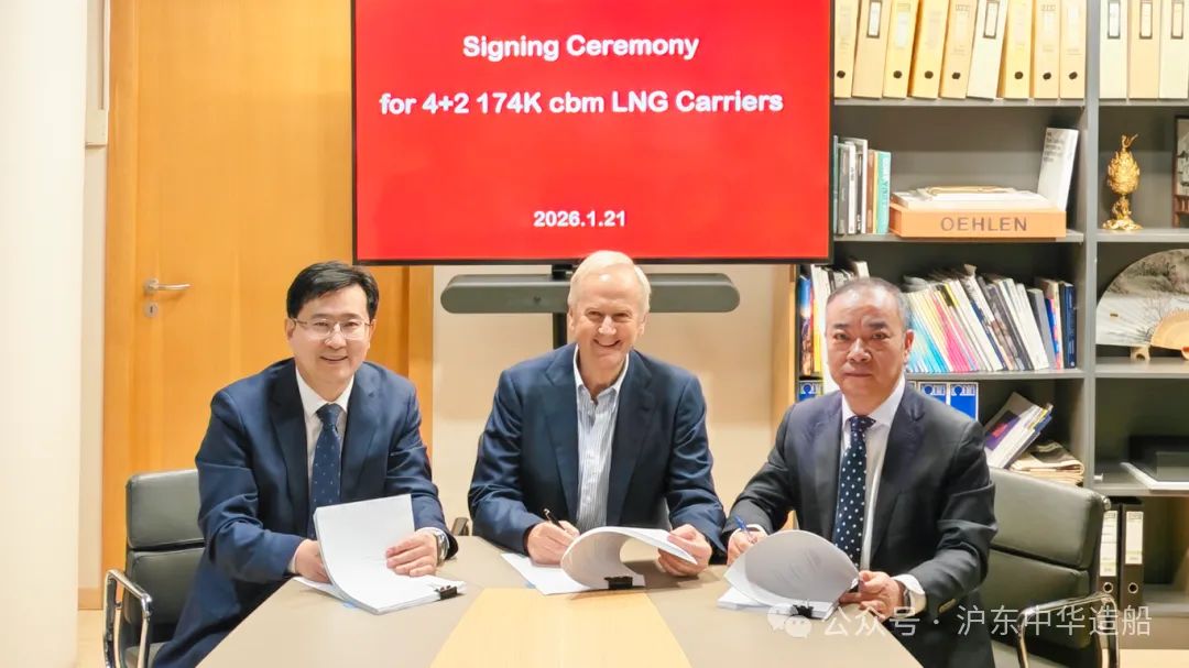 Μια ανάρτηση στο LinkedIn περιλαμβάνει φωτογραφία που δείχνει τον επικεφαλής της TMS Cardiff, Γιώργο Οικονόμου, στην τελετή υπογραφής μαζί με τη διοίκηση της Hudong-Zhonghua Shipbuilding, μπροστά από μια οθόνη που αναφέρει ότι η συμφωνία αφορά τέσσερα πλοία μεταφοράς LNG χωρητικότητας 174.000 cbm, με option για δύο ακόμη.