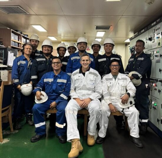Erwin Eleazar, Oiler· Danylo Shvets, 3ος Μηχανικός· Gideon Milagrosa, Ηλεκτροτεχνικός Υπάλληλος· Arnold Basa, Ηλεκτρολόγος· Christopher Marcon, Oiler· Christian Cabrera, 4ος Μηχανικός· Danilo Valdez, Συναρμολογητής· Ron Christopher Manaois, 2ος Μηχανικός· Michael Zewdie, 3ος Μηχανικός Από αριστερά προς τα δεξιά, καθιστοί: John Patrick Toleno, 2ος Μηχανικός· Νικόλας Μαρτίνος, Διευθύνων Σύμβουλος της Thenamaris, Tristan Alissandro Saniel, Αρχιμηχανικός.