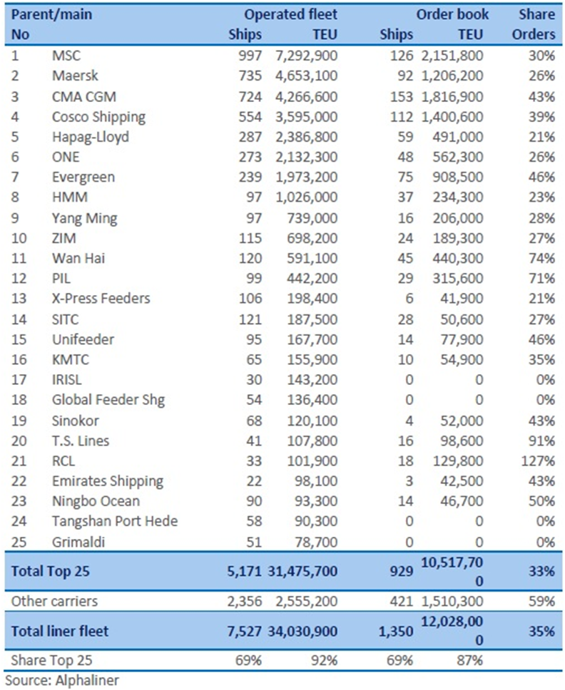 Συγκρίνοντας την τρέχουσα Top 25 με την κατάσταση πριν από ένα χρόνο προκύπτει ότι είκοσι μία ναυτιλιακές εταιρείες αύξησαν την λειτουργική τους χωρητικότητα.