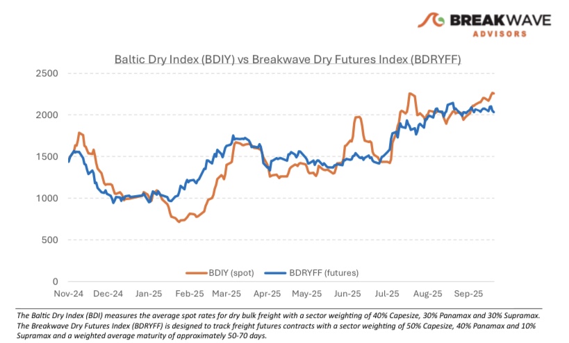 Οι τιμές των futures ήδη αντανακλούν αυτή την πιθανή αδυναμία, ιδίως στα Panamax και Supramax, με τα συμβόλαια του Οκτωβρίου να κινούνται χαμηλότερα από τα τρέχοντα επίπεδα spot. Αντίθετα, τα συμβόλαια μελλοντικής εκπλήρωσης των Capesizes εμφανίζονται πιο αισιόδοξα, παραμένοντας κοντά στα σημερινά επίπεδα της αγοράς.