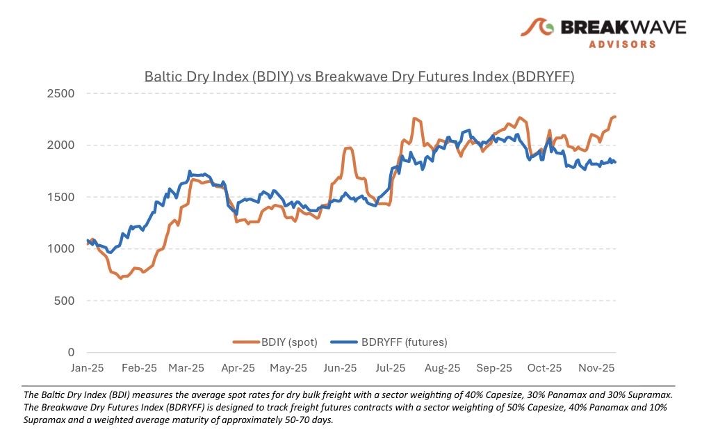 Τα ναύλα για τα μεγάλα Capesize φορτηγά πλοία υπερβαίνουν τα 30.000 δολάρια την ημέρα. Σε συνδυασμό με τη χαμηλότερη του μέσου όρου μεταβλητότητα, υποδηλώνουν την εμπιστοσύνη της αγοράς στην πορεία των μελλοντικών τιμών. Υψηλά, σχετικά με την εποχή, προβλέπονται τα ναύλα ακόμη και μέσα στο πρώτο τρίμηνο του 2026.