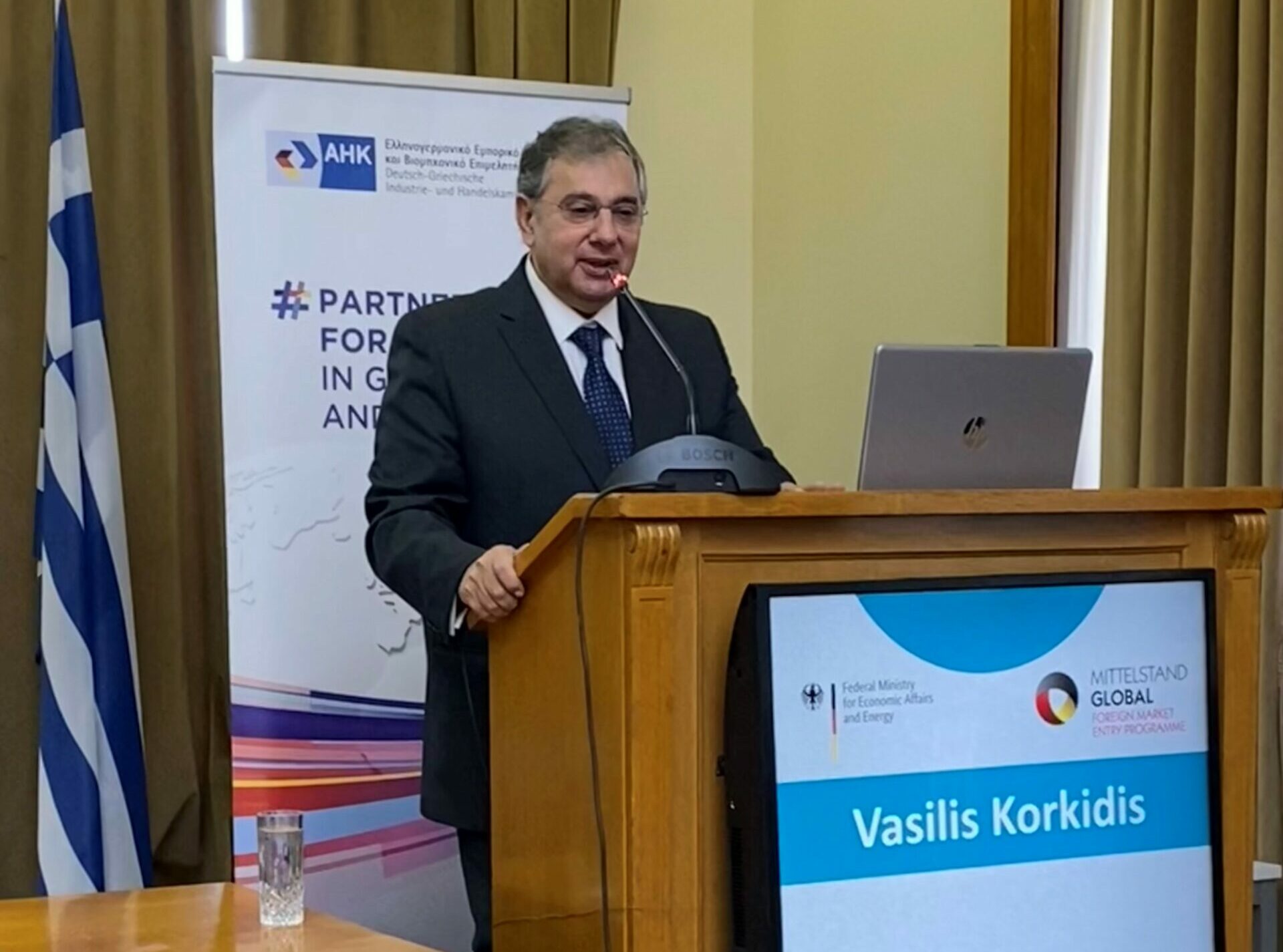Ο Πρόεδρος του Εμπορικού και Βιομηχανικού Επιμελητηρίου Πειραιώς, Βασίλης Κορκίδης, καλωσόρισε στο συμπόσιο, που έλαβε χώρα στο Μέγαρο του Ε.Β.Ε.Π., τους εκλεκτούς καλεσμένους από το Ελληνογερμανικό Επιμελητήριο, καθώς και τους εκπροσώπους των 11 γερμανικών και 43 ελληνικών εταιρειών του ναυτιλιακού κλάδου.