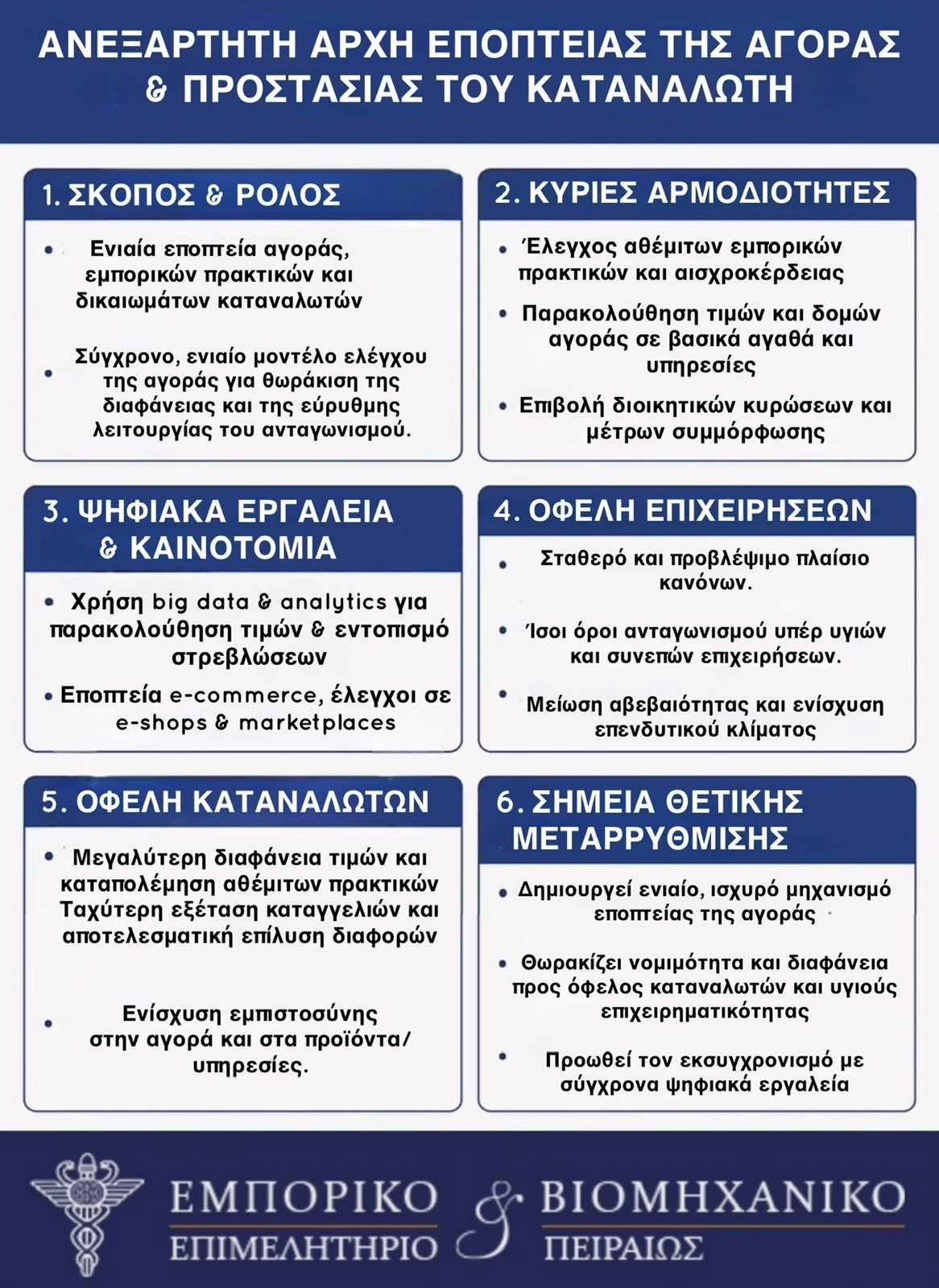 Το Εμπορικό και Βιομηχανικό Επιμελητήριο Πειραιώς (Ε.Β.Ε.Π.) θεωρεί πολύ σημαντική θεσμική τομή το Σχέδιο Νόμου για την ενίσχυση της διαφάνειας, της εύρυθμης λειτουργίας της αγοράς και της προστασίας των καταναλωτών. Η δημιουργία μιας σύγχρονης και λειτουργικά ανεξάρτητης Αρχής ανταποκρίνεται στα ευρωπαϊκά πρότυπα εποπτείας, ενισχύει την εμπιστοσύνη στο οικονομικό περιβάλλον και συμβάλλει στην αποτελεσματικότερη αντιμετώπιση στρεβλώσεων, αθέμιτων πρακτικών και φαινομένων αισχροκέρδειας.