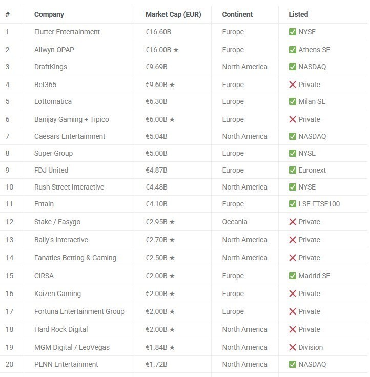 Η επιχειρηματική συνένωση της Allwyn με τον ΟΠΑΠ δημιούργησε έναν όμιλο αποτίμησης 16 δισ. ευρώ, που πρακτικά λειτουργεί ως η μεγαλύτερη ευρωπαϊκή δύναμη σε λοταρίες και μία από τις πιο ισχυρές πλατφόρμες B2C παγκοσμίως. Ακολουθούν η DraftKings με 9,69 δισ. ευρώ και η Bet365 με εκτιμώμενη αξία 9,60 δισ. ευρώ, επιβεβαιώνοντας την κυριαρχία των ΗΠΑ και του Ηνωμένου Βασιλείου στο ψηφιακό στοίχημα.