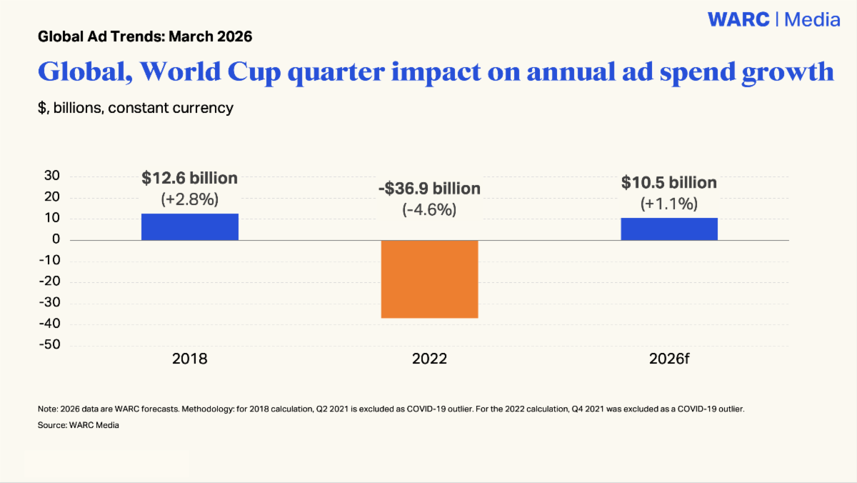 Το Μουντιάλ 2026, που θα διεξαχθεί σε Ηνωμένες Πολιτείες, Μεξικό και Καναδά, αναμένεται να προσθέσει 10,5 δισ. ευρώ στην παγκόσμια διαφημιστική αγορά, σύμφωνα με την τελευταία μελέτη της WARC Media. Η αύξηση αυτή αντιστοιχεί σε μόλις 1,1% ετήσια ενίσχυση της διαφημιστικής δαπάνης, σαφώς χαμηλότερη από το +2,8% του 2018, όταν η διοργάνωση είχε προσθέσει 12,6 δισ. ευρώ.