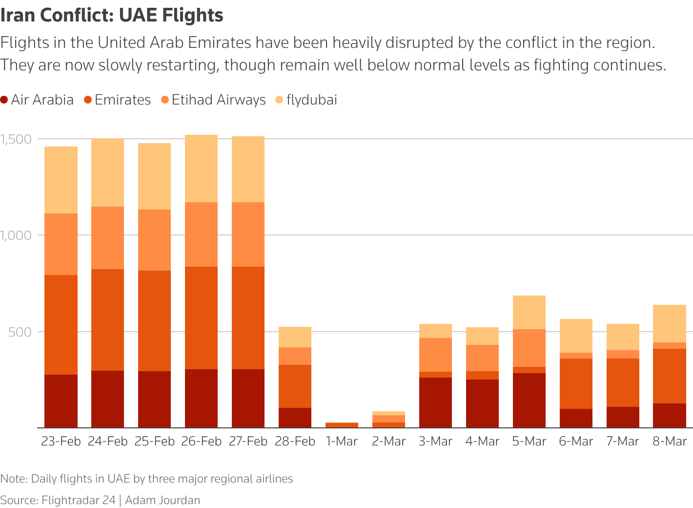 Από την 28η Φεβρουαρίου, όταν ξεκίνησε ο πόλεμος ΗΠΑ-Ισραήλ με το Ιράν, μέχρι τις 8 Μαρτίου, έχουν ακυρωθεί πάνω από 37.000 πτήσεις προς και από τη Μέση Ανατολή, σύμφωνα με στοιχεία της Cirium.