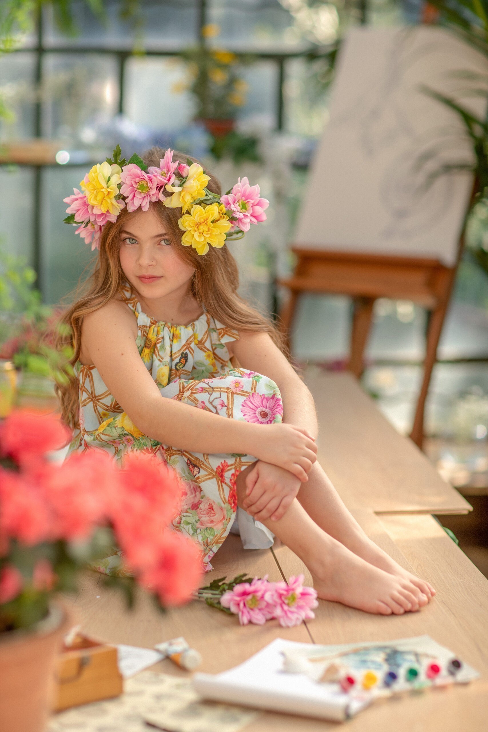 Τέσσερα τραπέζια γεμάτα λουλούδια, το καθένα σε διαφορετικό χρώμα: κόκκινο, μπλε, κίτρινο και πράσινο, αποτέλεσαν τη βάση της χρωματικής παλέτας της συλλογής.
