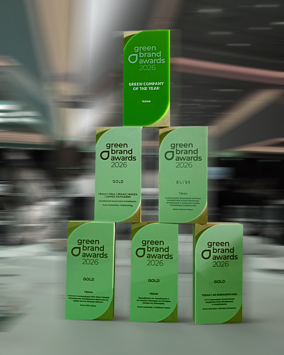 Η ΤΕΧΑΝ Α.Β.Ε.Ε., η πρωτοπόρος ελληνική εταιρεία ανακύκλωσης που κατασκευάζει, τοποθετεί & λειτουργεί τα τελευταίας τεχνολογίας Πολυκέντρα Ανακύκλωσης, τιμήθηκε με συνολικά 5 σημαντικές διακρίσεις στα Green Brand Awards 2026 και αναδείχθηκε Green Company of the Year, επιβεβαιώνοντας τον ηγετικό της ρόλο στην ανάπτυξη καινοτόμων λύσεων ανακύκλωσης & την προώθηση της κυκλικής οικονομίας.
