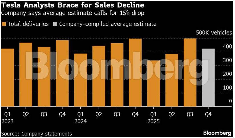 Σύμφωνα με τους υπολογισμούς του αμερικανικού κολοσσού ηλεκτρικών οχημάτων, οι αναλυτές αναμένουν κατά μέσο όρο παραδόσεις 422.850 οχημάτων στο τέταρτο τρίμηνο, αριθμός μειωμένος κατά 15% σε ετήσια βάση.