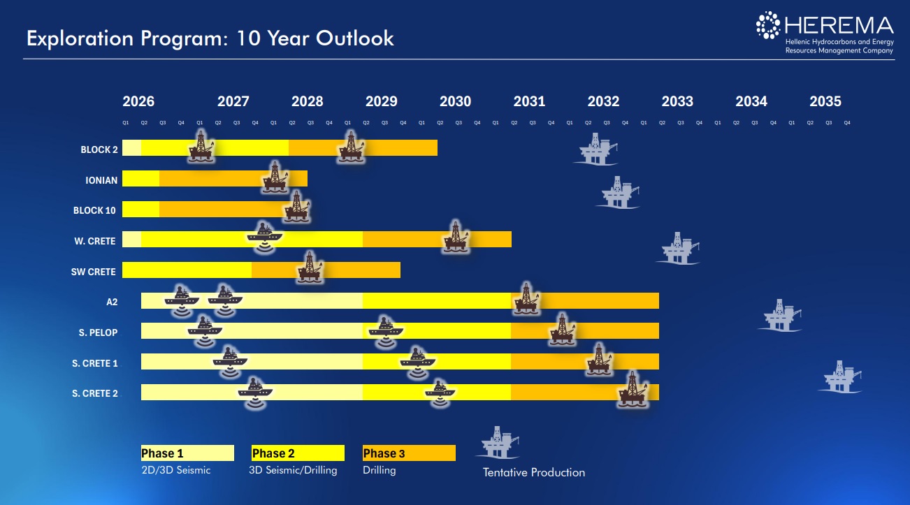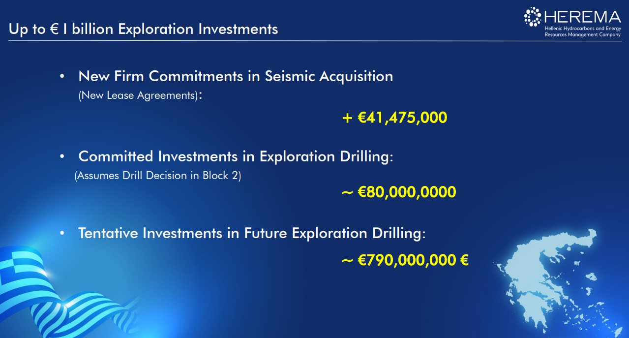 Όπως τόνισε ο CEO της HEREMA, Αριστοφάνης Στεφάτος οι νέες δεσμεύσεις για σεισμικές έρευνες ανέρχονται σε 41,475 εκατ. ευρώ, ενώ οι δεσμευμένες επενδύσεις σε ερευνητικές γεωτρήσεις –με την προϋπόθεση λήψης απόφασης γεώτρησης στο Block 2– φθάνουν περίπου τα 80 εκατ. ευρώ. Επιπλέον, οι μελλοντικές γεωτρητικές επενδύσεις που βρίσκονται στον ορίζοντα εκτιμώνται σε περίπου 790 εκατ. ευρώ . Συνολικά, το ύψος των exploration investments σημείωσε, ότι μπορεί να αγγίξει έως και το 1 δισ. ευρώ, επιβεβαιώνοντας ότι η φάση των ερευνητικών γεωτρήσεων αποτελεί τον βασικό επενδυτικό πυλώνα της επόμενης δεκαετίας .
