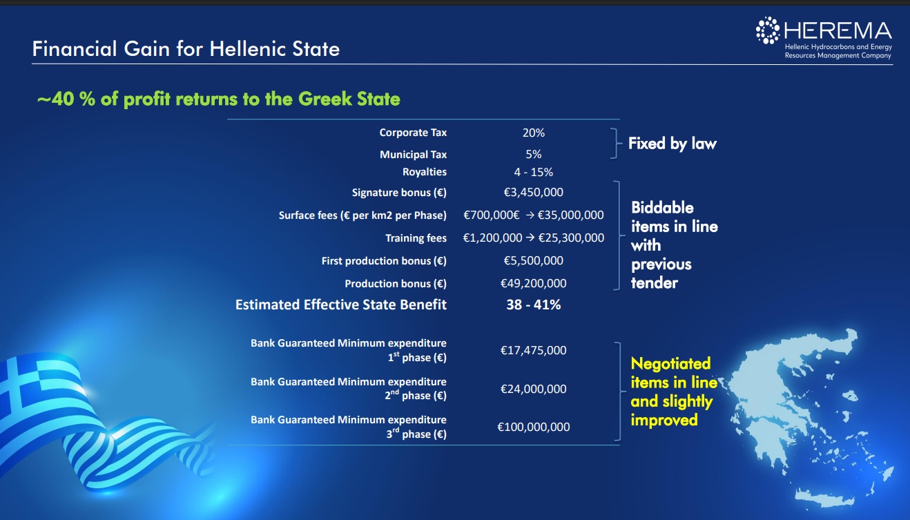 Οι νέες παραχωρήσεις υδρογονανθράκων ενισχύουν την ενεργειακή ασφάλεια και τη γεωπολιτική θέση της χώρας, και ταυτόχρονα φέρνουν επενδύσεις με άμεσο δημοσιονομικό και αναπτυξιακό αποτύπωμα.Το εκτιμώμενο συνολικό όφελος για το Ελληνικό Δημόσιο, σε περίπτωση παραγωγής, διαμορφώνεται κατά μέσο όρο στο 40%, συνυπολογίζοντας δικαιώματα (royalties), φόρο εισοδήματος 20%, περιφερειακό φόρο 5%, μπόνους υπογραφής και παραγωγής, μισθώματα και λοιπές καταβολές .