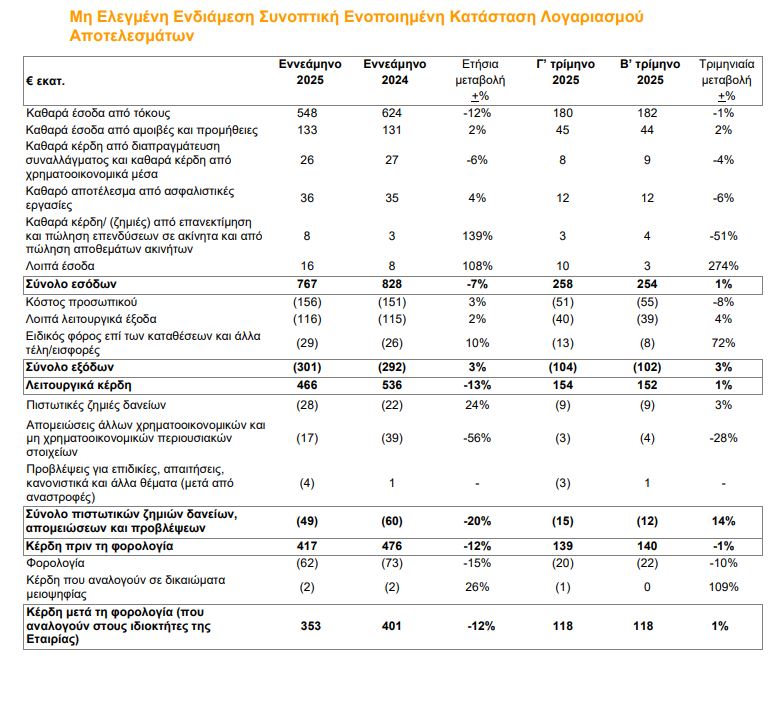 Αυτή η επίδοση αντανακλά την ανθεκτικότητα των καθαρών εσόδων από τόκους, παρά τη μείωση των επιτοκίων, την υψηλή ρευστότητα, την αποτελεσματική διαχείριση κόστους όπως αποδεικνύετε από τον δείκτη κόστος προς έσοδα ύψους 35%, καθώς και την ποιότητα του δανειακού μας χαρτοφυλακίου που παραμένει ισχυρή, με το ποσοστό ΜΕΔ προς δάνεια να ανέρχεται στο 1.2% στις 30 Σεπτεμβρίου 2025.