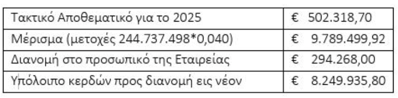 Η Γενική Συνέλευση αποφάσισε τη διανομή μερίσματος € 0,04 / μετοχή, καθώς και τη διανομή μέρους των κερδών για τη χρήση 2025 στο προσωπικό της Εταιρείας, σύμφωνα με τον παρακάτω πίνακα: