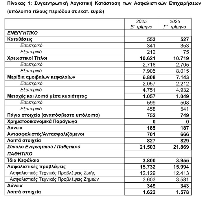 Η συνολική αξία του ενεργητικού των ασφαλιστικών επιχειρήσεων αυξήθηκε κατά 366 εκατ. ευρώ σε σχέση με το προηγούμενο τρίμηνο και διαμορφώθηκε στα 21.869 εκατ. ευρώ στο τέλος του γ΄ τριμήνου του 2025, σύμφωνα με τα στοιχεία της Τράπεζας της Ελλάδος.