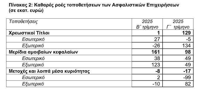 Από την πλευρά του παθητικού, τα ίδια κεφάλαια αυξήθηκαν στα 3.955 εκατ. ευρώ στο τέλος του γ΄ τριμήνου του 2025, έναντι 3.800 εκατ. ευρώ το προηγούμενο τρίμηνο.