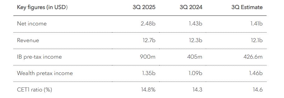 Η τράπεζα με έδρα τη Ζυρίχη ανακοίνωσε καθαρά κέρδη 2,5 δισ. δολαρίων για τους τρεις μήνες έως τον Σεπτέμβριο, έναντι εκτιμήσεων για 1,4 δισ. δολάρια, αυξημένα κατά 74% σε σχέση με το αντίστοιχο τρίμηνο του 2024. Τα αποτελέσματα της ενισχύθηκαν από την αποδέσμευση προβλέψεων που σχετίζονται με τον διακανονισμό μιας υπόθεσης φοροδιαφυγής στη Γαλλία και με μια παλαιά νομική υπόθεση της Credit Suisse.