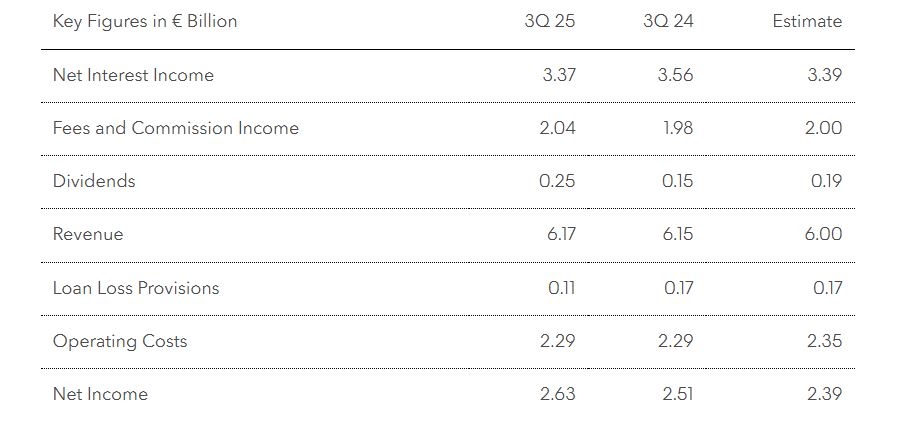 Τα συνολικά έσοδα αυξήθηκαν κατά 0,3%, καθώς η μείωση των εσόδων από δάνεια αντισταθμίστηκε από την άνοδο στα μερίσματα, τις προμήθειες και τα έσοδα από συναλλαγές. Οι νέες προβλέψεις για επισφαλή δάνεια υποχώρησαν στα 113 εκατ. ευρώ, ενώ τα αποθέματα ασφαλείας για ενδεχόμενες απώλειες ανήλθαν σε περίπου 1,7 δισ. ευρώ.