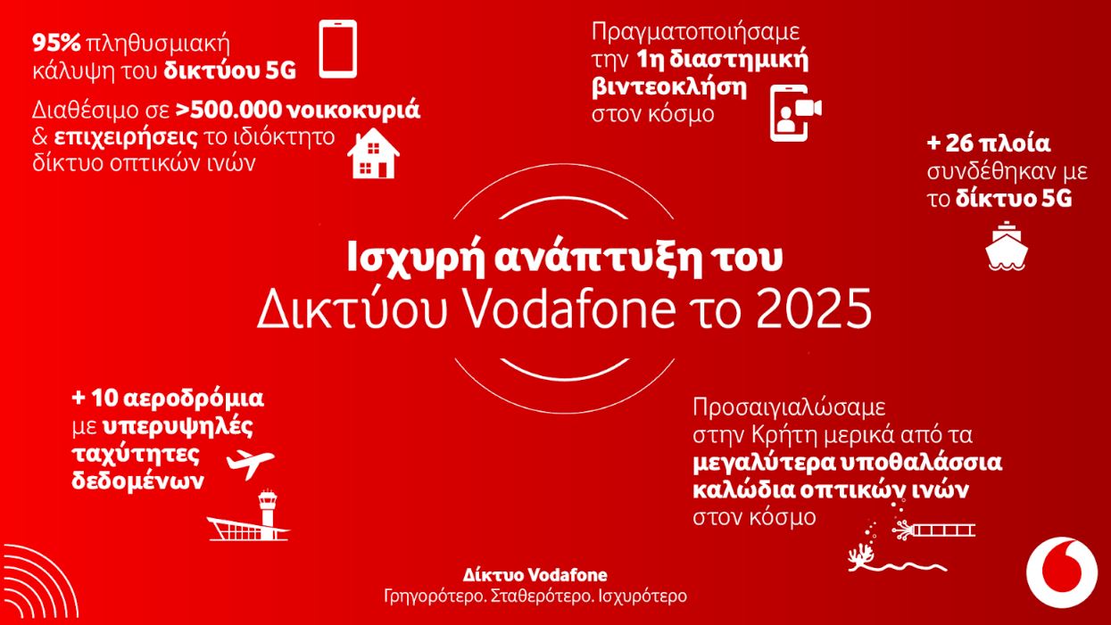 Ακόμη έναν κύκλο δυναμικών επενδύσεων και τεχνολογικών εξελίξεων ολοκλήρωσε η Vodafone το 2025, ενισχύοντας ουσιαστικά το δίκτυο κινητής και σταθερής τηλεφωνίας σε ολόκληρη τη χώρα και διαμορφώνοντας νέες προοπτικές συνδεσιμότητας για πολίτες, επιχειρήσεις και επισκέπτες.