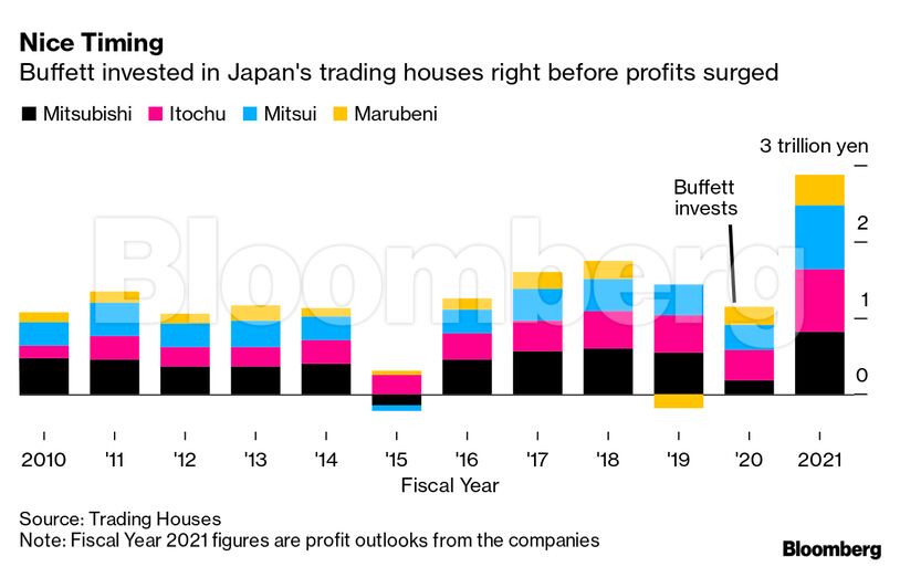 Ο Buffett προκάλεσε έκπληξη στις αγορές το 2020, όταν η επενδυτική του εταιρεία Berkshire Hathaway, ανακοίνωσε ότι αγόρασε μερίδια σε πέντε από τις μεγαλύτερες εμπορικές εταιρείες της Ιαπωνίας, οι οποίες εκείνη την εποχή αντιμετώπιζαν μείωση κερδών καθώς η πανδημία περιόρισε τη ζήτηση για καύσιμα.