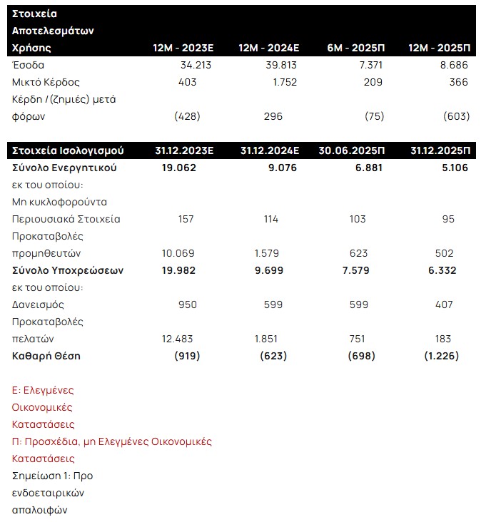 1. Συγκριτικά Οικονομικά Μεγέθη KF και Ομίλου. Όπως αναφέρεται στην από 24/02/2026 ανακοίνωση, η αποεπένδυση από την KF εντάσσεται στη στρατηγική απόφαση της Διοίκησης για αποδέσμευση από ζημιογόνες δραστηριότητες του εξωτερικού, λαμβάνοντας υπόψη την επιδείνωση των οικονομικών της μεγεθών και την αρνητική καθαρή θέση της εταιρείας κατά το χρόνο της μεταβίβασης. Στους παρακάτω πίνακες παρατίθενται κατά σειρά τα οικονομικά στοιχεία της KF και των θυγατρικών της και τα ενοποιημένα οικονομικά στοιχεία του ομίλου Y/KNOT Invest, πρώην ομίλου ΚΥΡΙΑΚΟΥΛΗΣ ΜΕΣΟΓΕΙΑΚΑΙ ΚΡΟΥΑΖΙΕΡΑΙ (ο «Όμιλος»):