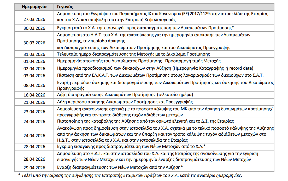 Το αναμενόμενο χρονοδιάγραμμα της ολοκλήρωσης της Αύξησης και της εισαγωγής προς διαπραγμάτευση των Νέων Μετοχών είναι το εξής: