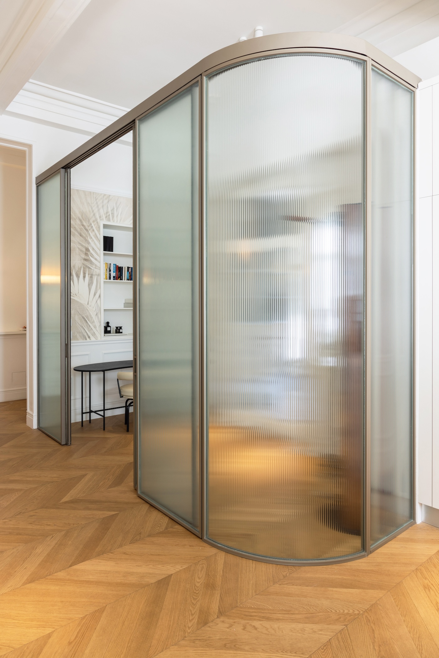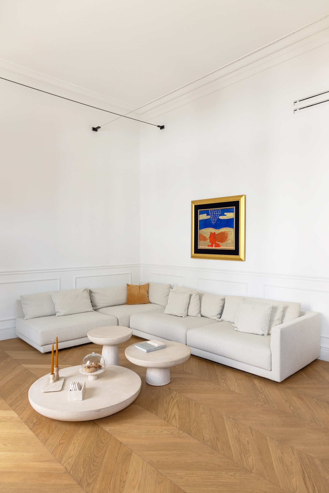 Τα τσιμεντένια διακοσμητικά πλακίδια που συνδέονται με την ιστορία του κτιρίου δημιουργούν ένα χαλί σε όλα τα μπαλκόνια, τα οποία βρίσκονται σε άμεση σύνδεση με το εσωτερικό, ενώ τo πάτωμα ντύνεται με ένα ξύλινο ψαροκόκαλο, ένα από τα παλαιότερα σχέδια παρκέ στην Ευρώπη, εμπνευσμένο από τον τρόπο τοποθέτησης των τούβλων σε παλιές εκκλησίες και κάστρα.