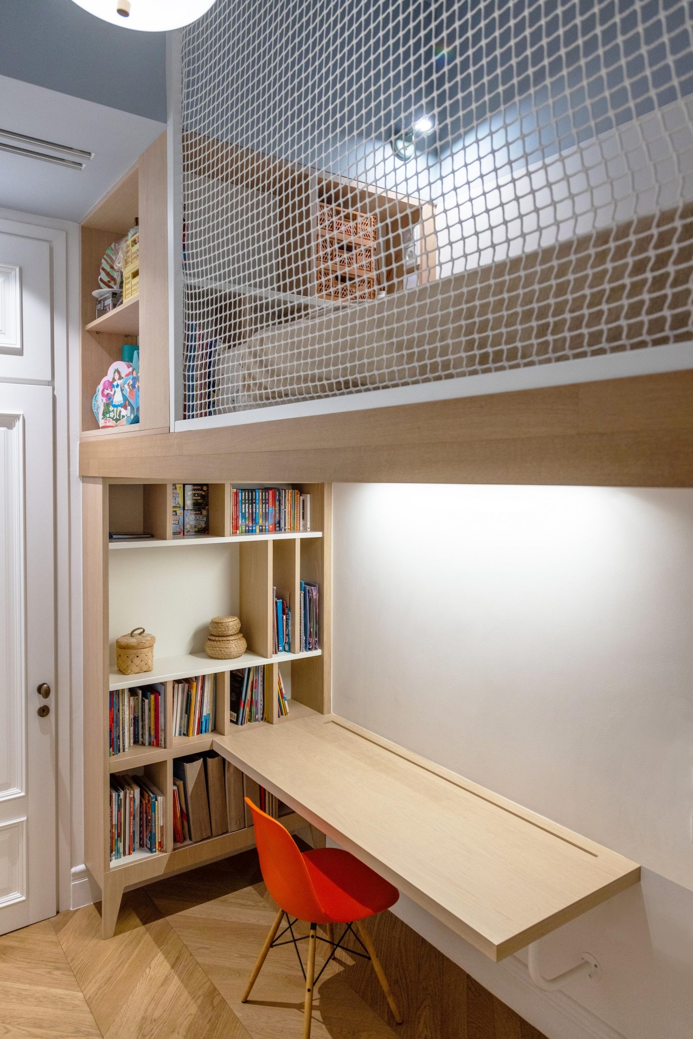 Ακριβώς από κάτω της αναπτύσσονται η ντουλάπα, το γραφείο και η βιβλιοθήκη.