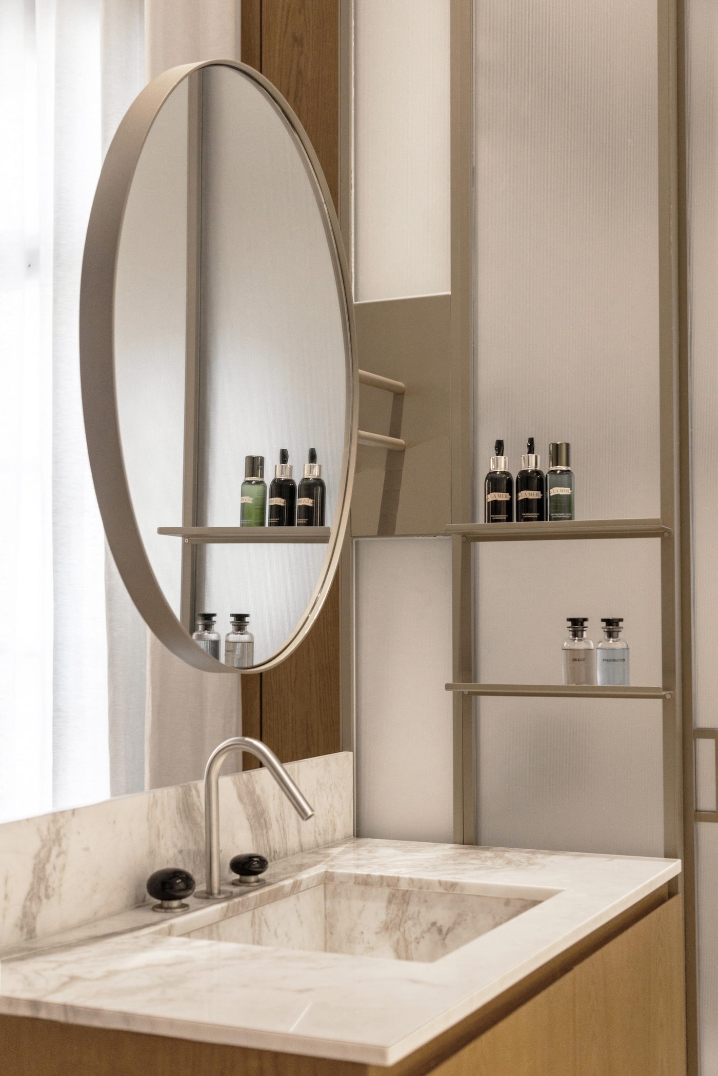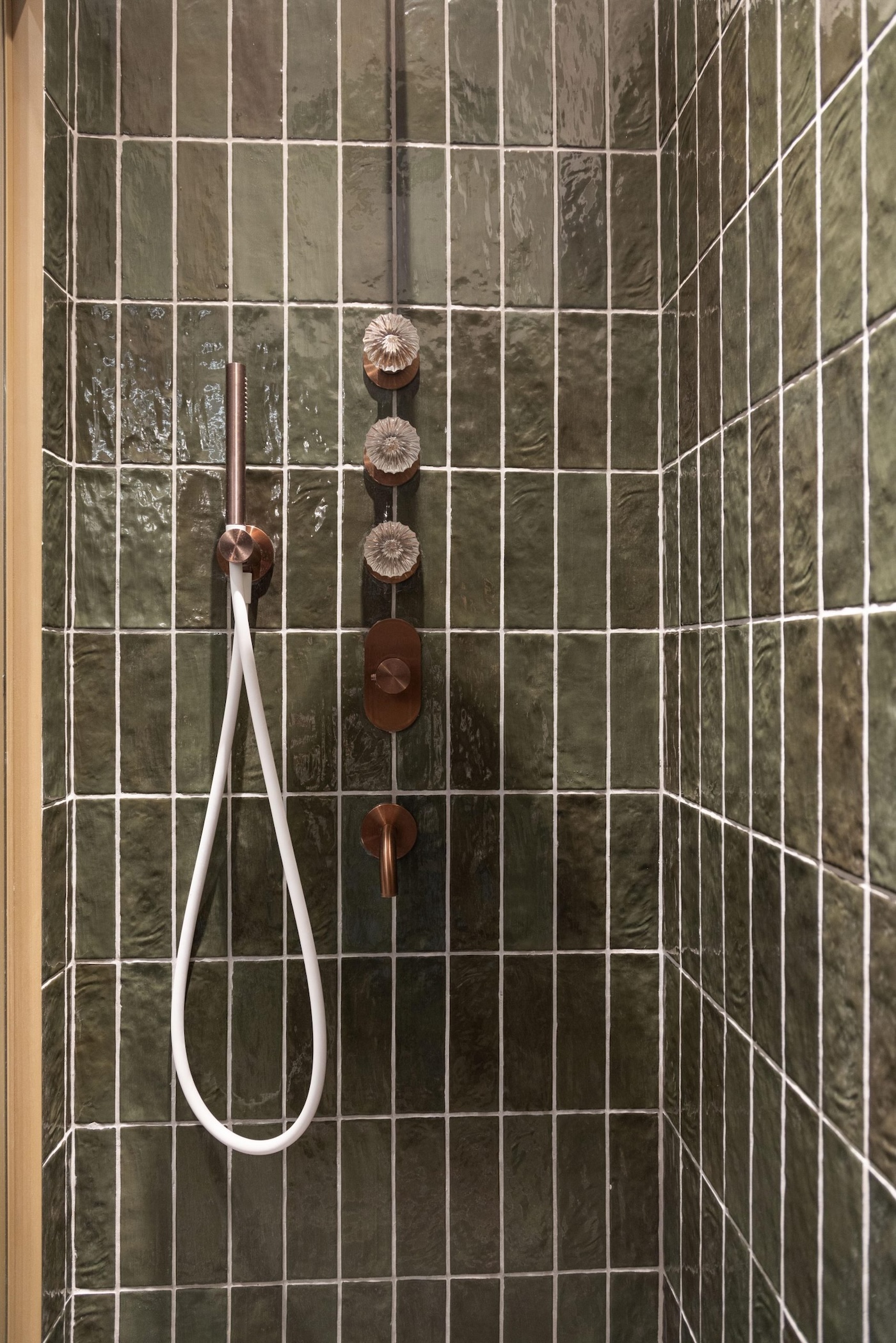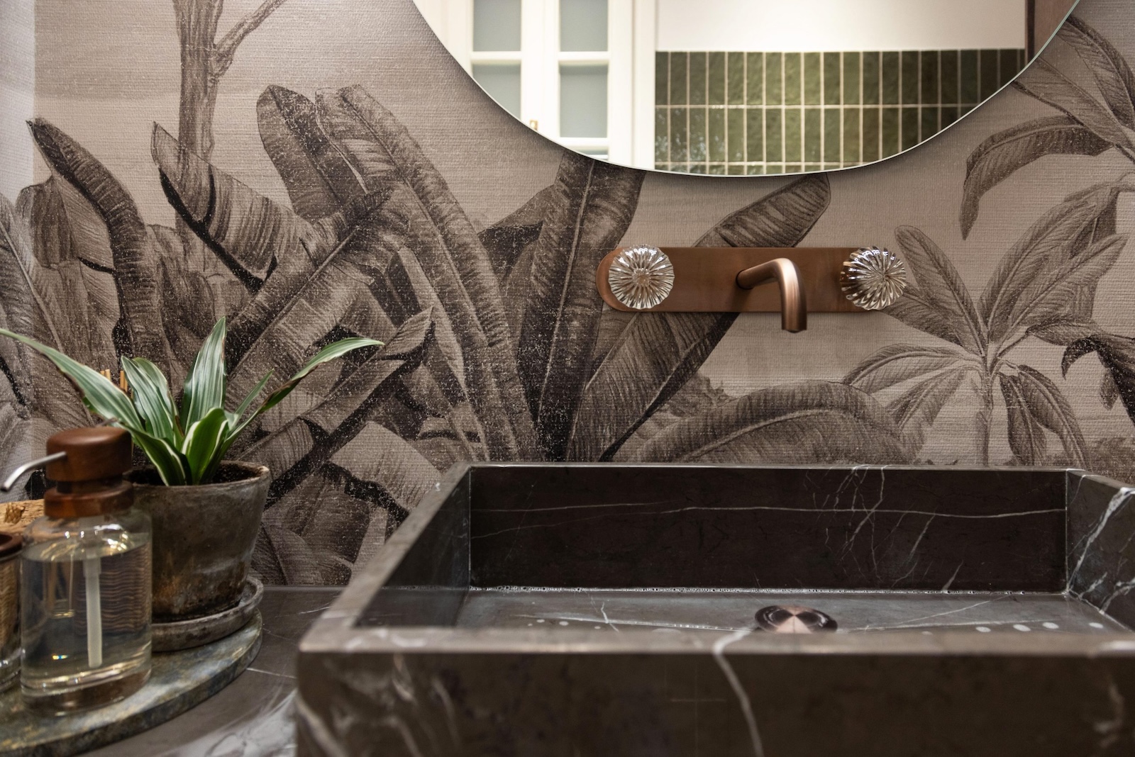 Στο κοινόχρηστο λουτρό το γκρι μάρμαρο συνδυάζεται με πράσινα κεραμικά πλακίδια και μια αποικιακού στυλ ταπετσαρία, προσδίδοντας στο χώρο θεατρικότητα.