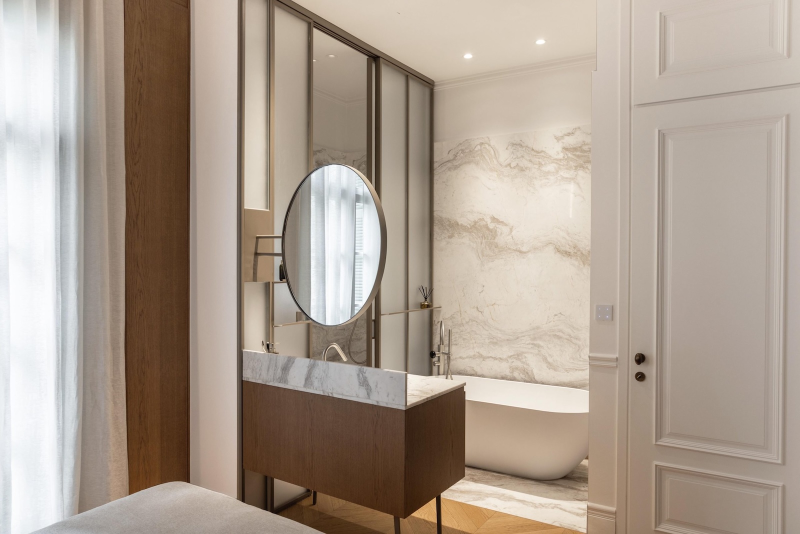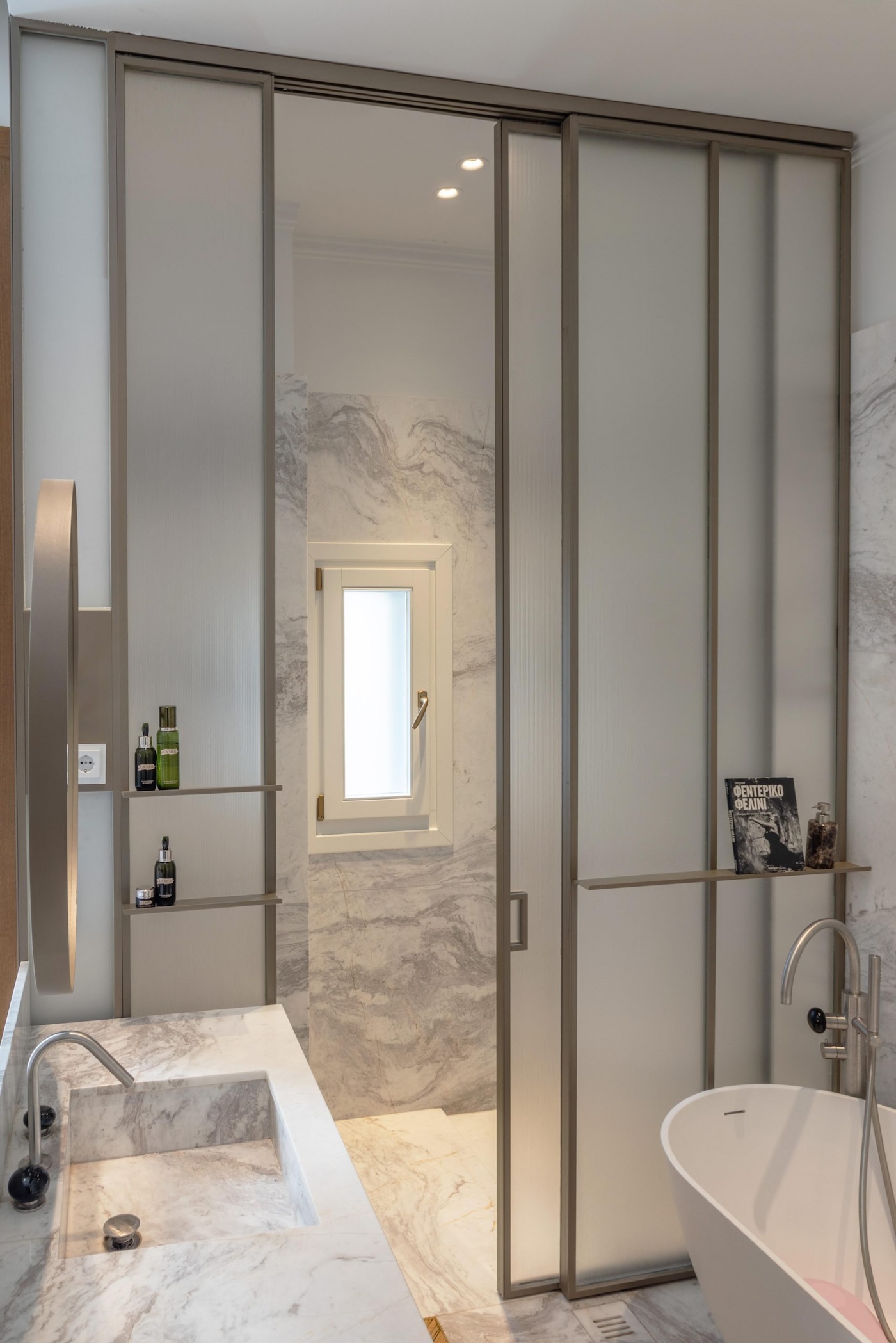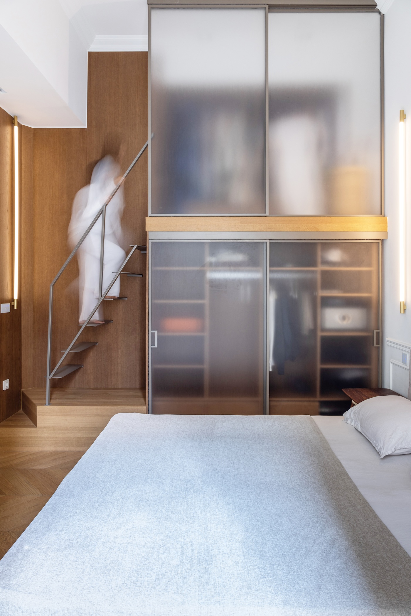 Στην κρεβατοκάμαρα κυριαρχεί το ξύλο, ενώ το λευκό μάρμαρο ντύνει το χώρο του ιδιωτικού μπάνιου, δημιουργώντας το ιδανικό φόντο για την ελεύθερης τοποθέτησης μπανιέρα. Η διώροφη ντουλάπα κατασκευάστηκε από γυαλί και μέταλλο, όπως ακριβώς και οι συρόμενες πόρτες του ντουζ.