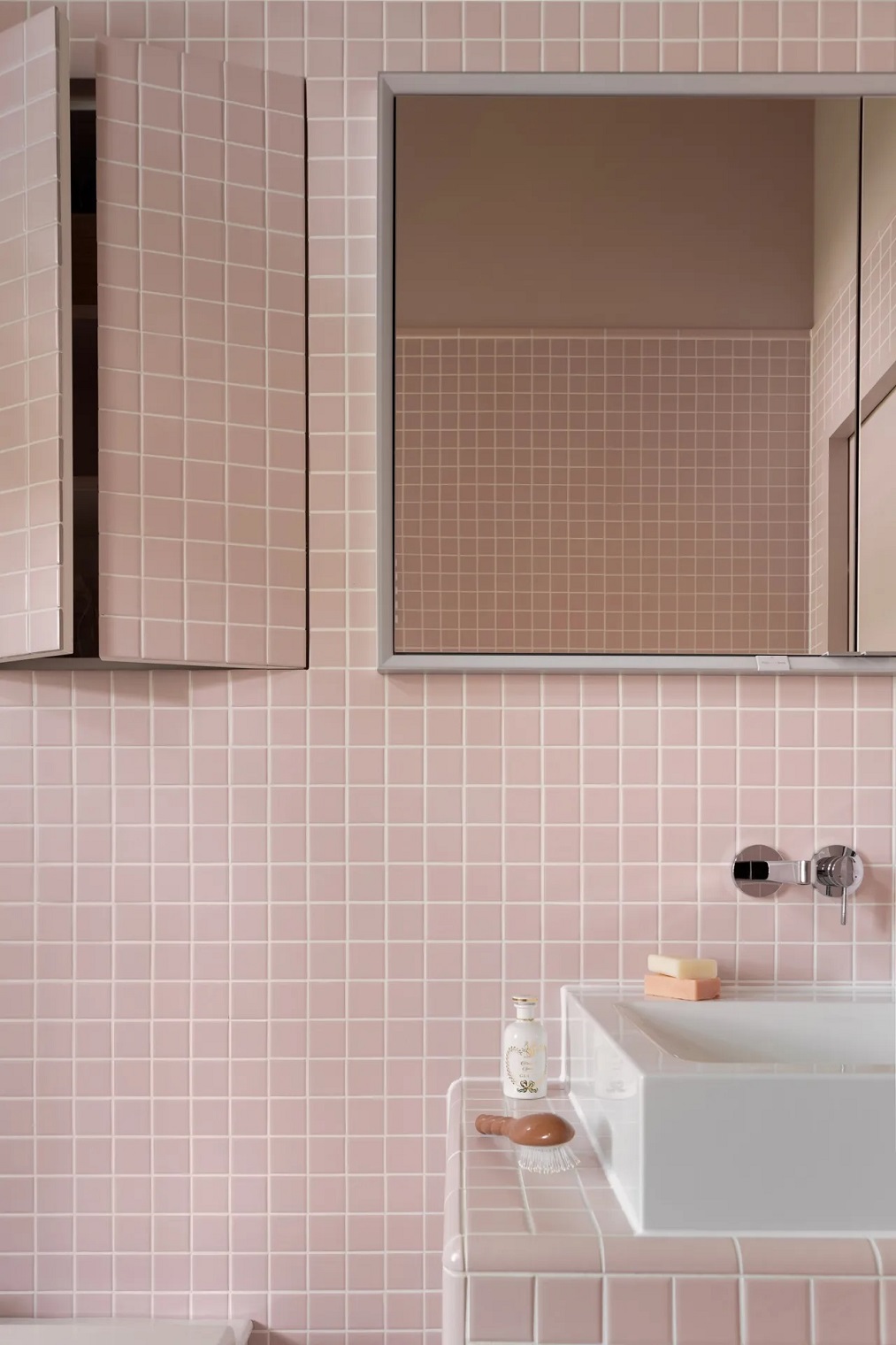 Το μπάνιο, από την άλλη, είναι μια εγκάρδια ωδή στη vintage καλλιτεχνική σκηνή του Βερολίνου, με ροζ κεραμικά πλακάκια από την Ceramica Vogue, εμπνευσμένα από την αισθητική της δεκαετίας του 1960, τα οποία συνδυάζονται αρμονικά με σύγχρονα στοιχεία για να δημιουργήσουν μια ατμόσφαιρα εμποτισμένη με έντονο χαρακτήρα.