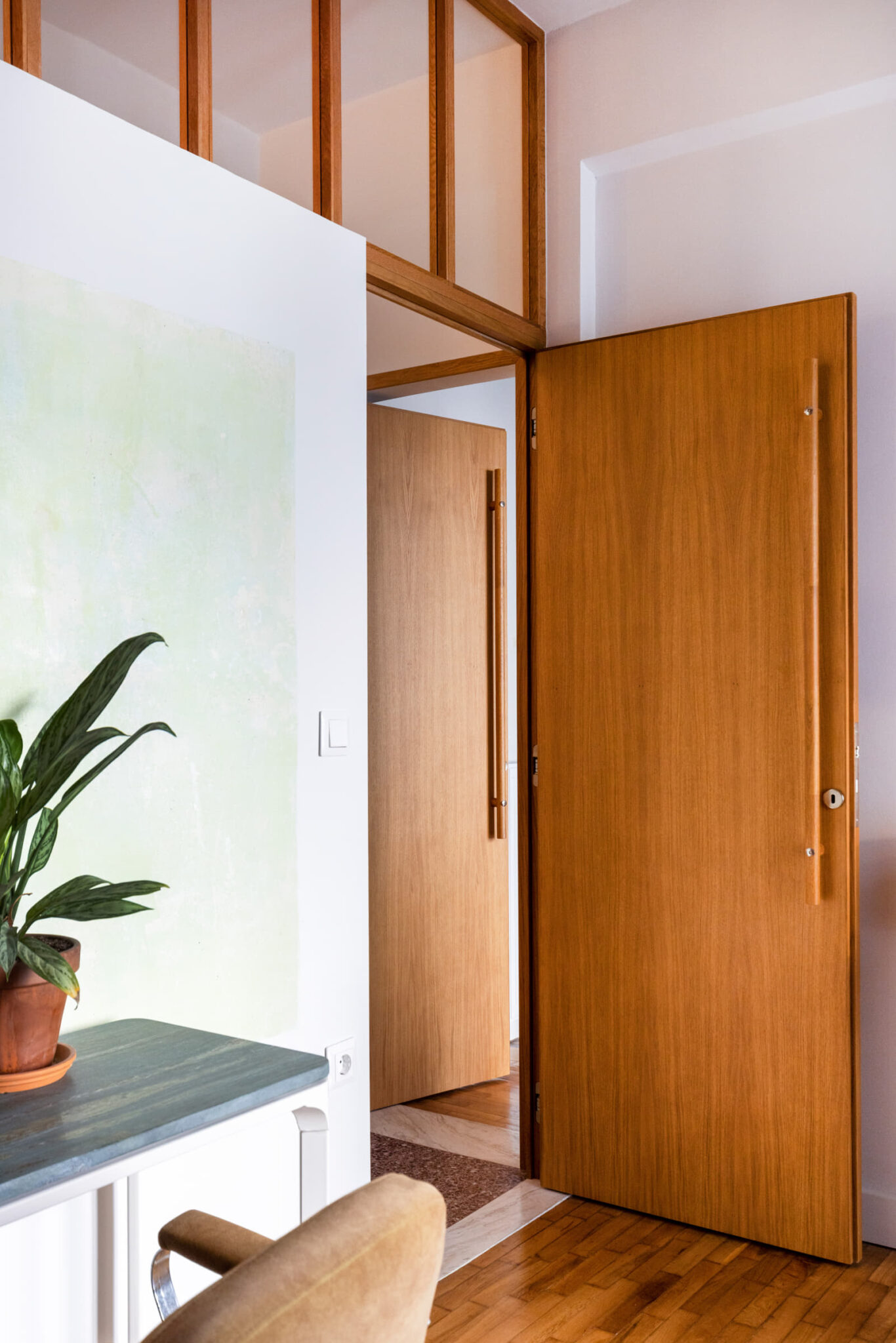 Ένας δεύτερος φεγγίτης στον τοίχο μεταξύ προθαλάμου και γραφείου φωτίζει την είσοδο, αποκαλύπτοντας παράλληλα το μεγάλο συνολικό βάθος του διαμπερούς διαμερίσματος.