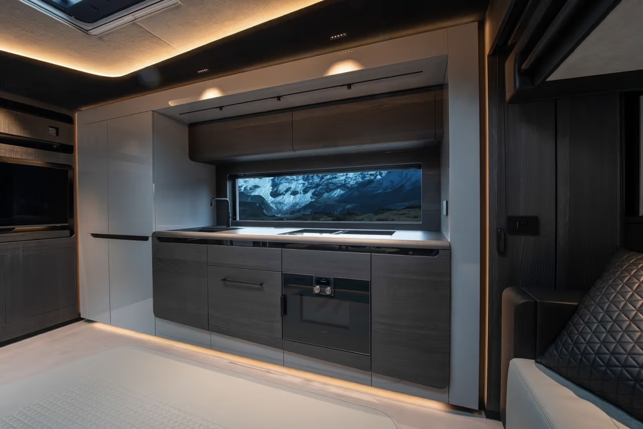 Βεβαίως, το αυτοκινούμενο είναι πλήρως εξοπλισμένο με μοντέρνα κουζίνα, ψυγείο κρασιού, καφετιέρα και πολυτελή τραπεζαρία.