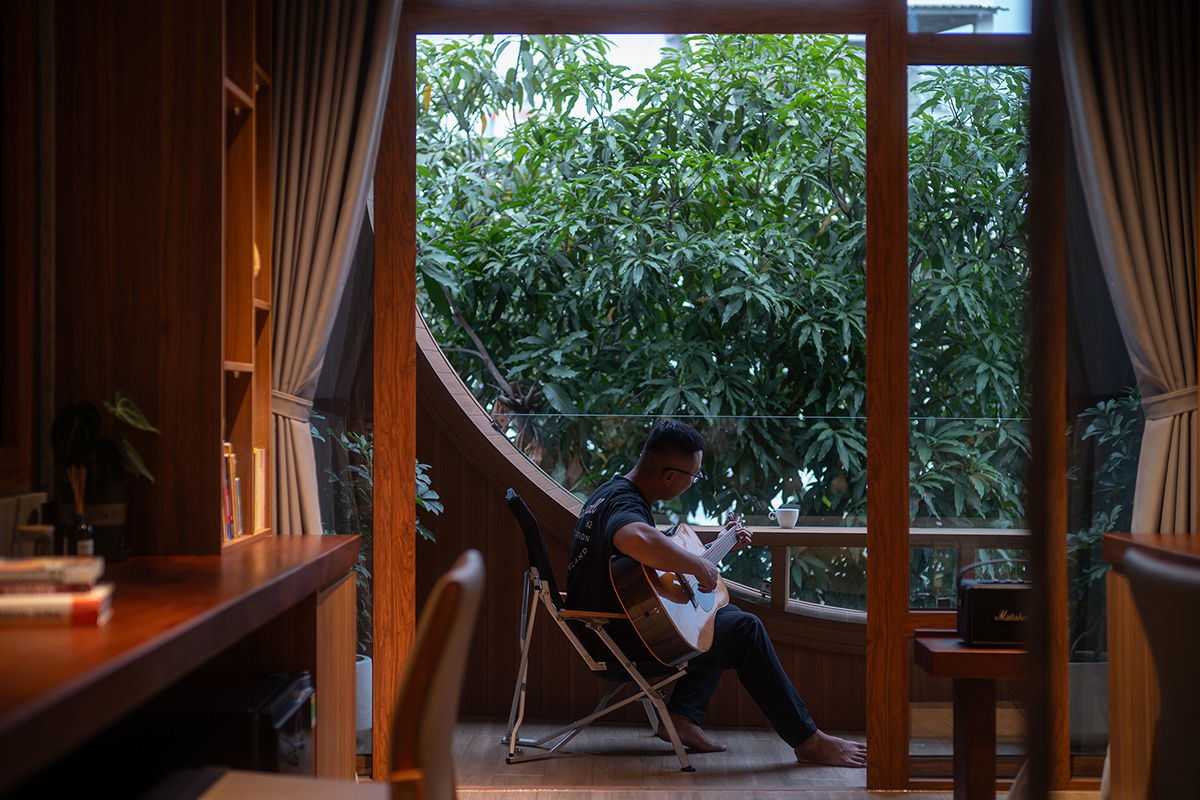 Το άνοιγμα έχει αναλογίες που παραπέμπουν σε ένα απλό, καλυβόμορφο πλαίσιο, ενισχύοντας την άμεση οπτική σχέση με τον ουρανό και με ένα υπάρχον δέντρο μάνγκο, το οποίο διατηρήθηκε στο οικόπεδο.