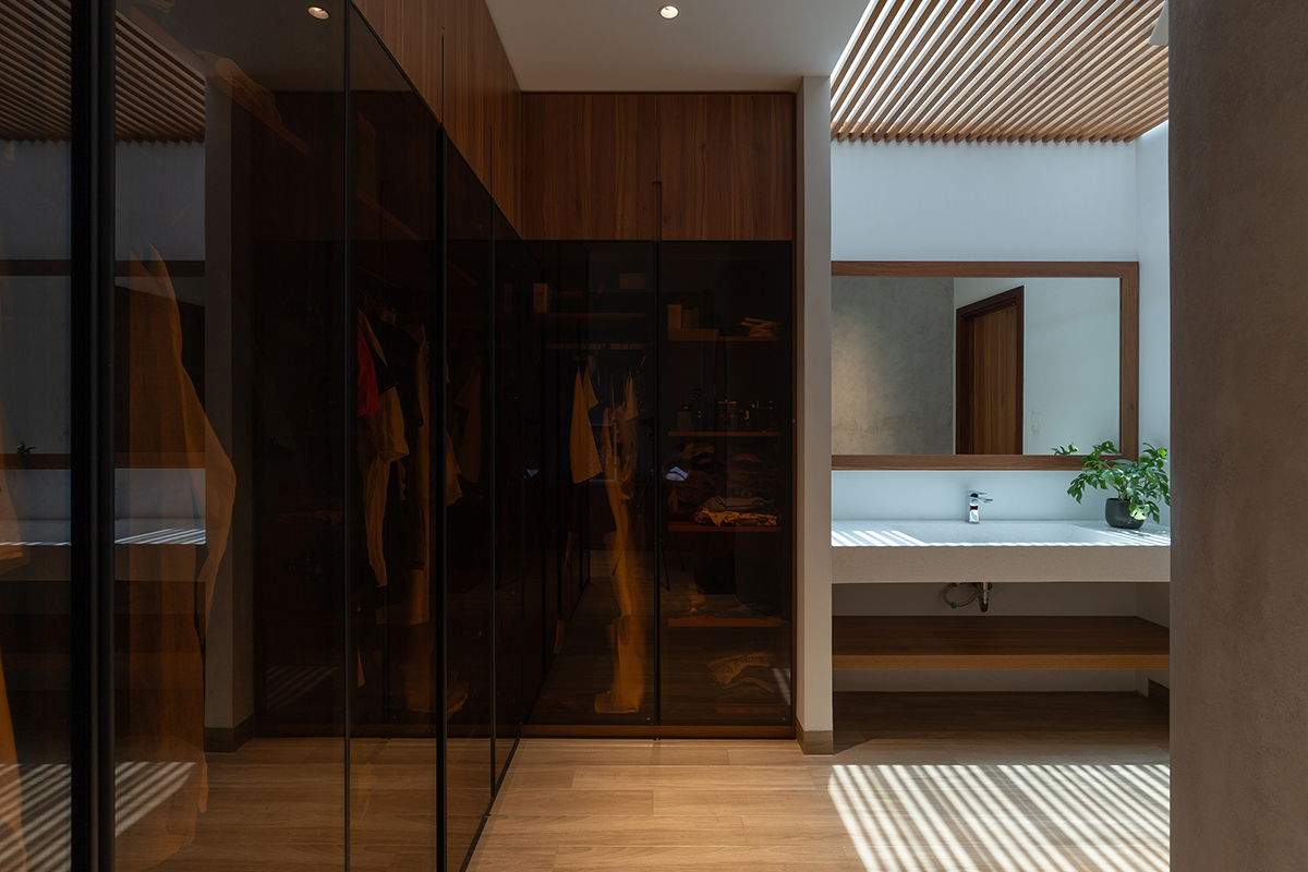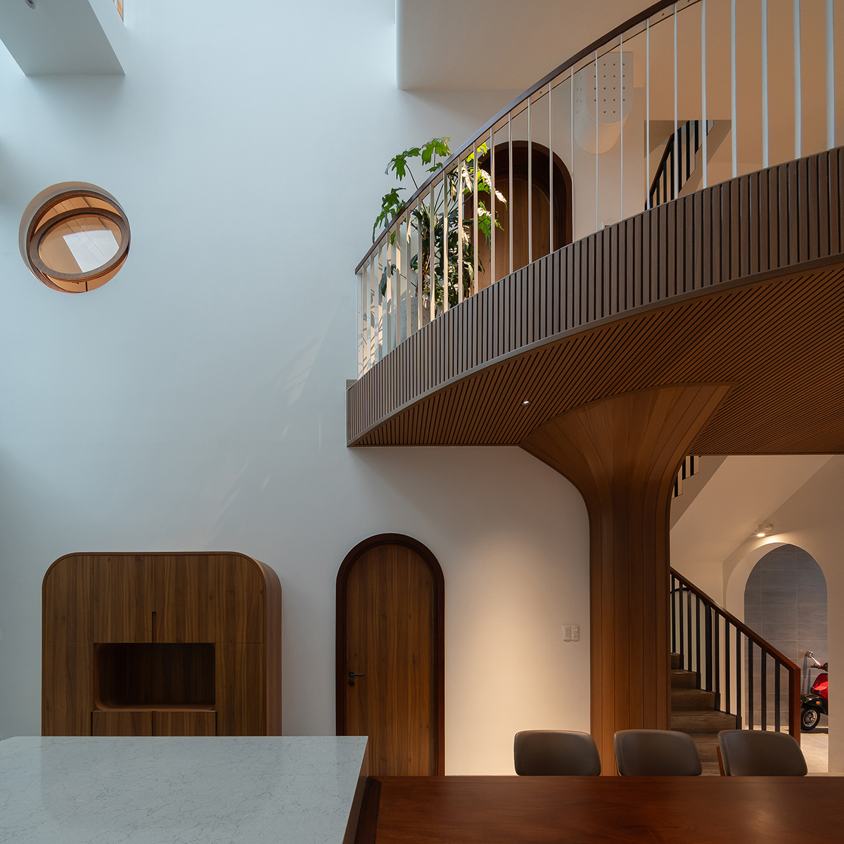 Στην κουζίνα ενσωματώνεται ένα κατακόρυφο κενό που ανεβαίνει προς τα πάνω, βελτιώνοντας τη διείσδυση του φυσικού φωτός και τον αερισμό, ενώ παράλληλα συνδέει οπτικά πολλαπλά επίπεδα της κατοικίας.