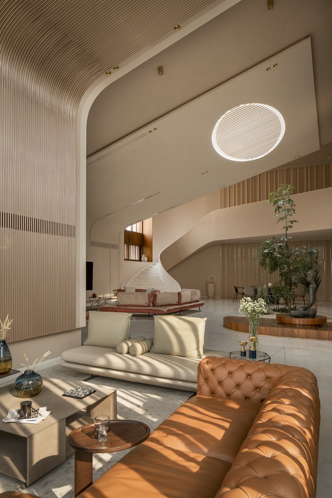 Για να επιτευχθεί αυτή τη ρευστότητα που παρατηρούμε στο χώρο, επιλέχθηκε αυτό που προσομοιάζει με μια κινούμενη ενότητα που ποικίλλει κατά μήκος του σπιτιού. Τα διάφορα προφίλ οροφής του προσθέτουν μαγεία σε ένα παιχνίδι όγκων και χώρων στο εσωτερικό, καθιστώντας το μια αισθητηριακή εμπειρία.