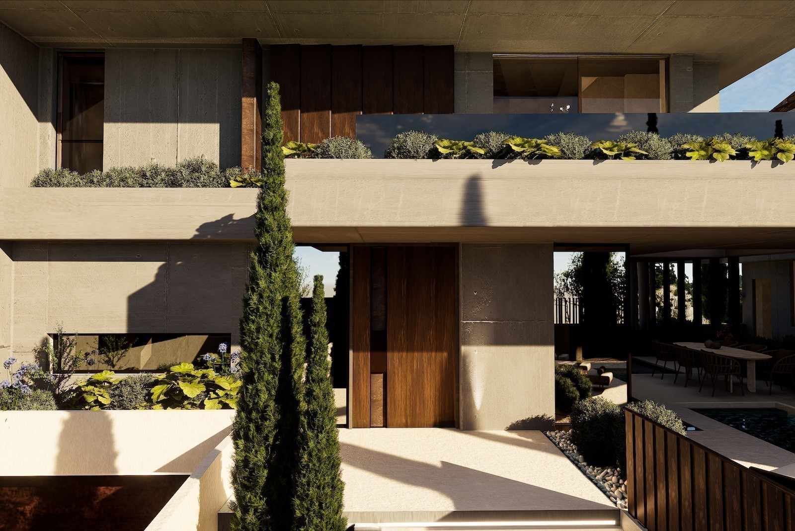 Εύλογα λοιπόν η ιδέα της Villa Earth έφερε ένα κύμα επιθυμιών και αντιδράσεων, από τις οποίες μεταξύ άλλων γεννήθηκε η κατοικία στη Γλυφάδα, η οποία διερευνά τη σύγχρονη μορφή μέσα από έντονες προεξοχές και μεταβαλλόμενες σκιάσεις, χρησιμοποιώντας το φως και τη συνέχεια με το εξωτερικό ως βασικά χωρικά της εργαλεία αντί για τη σύνθεση της όψης.