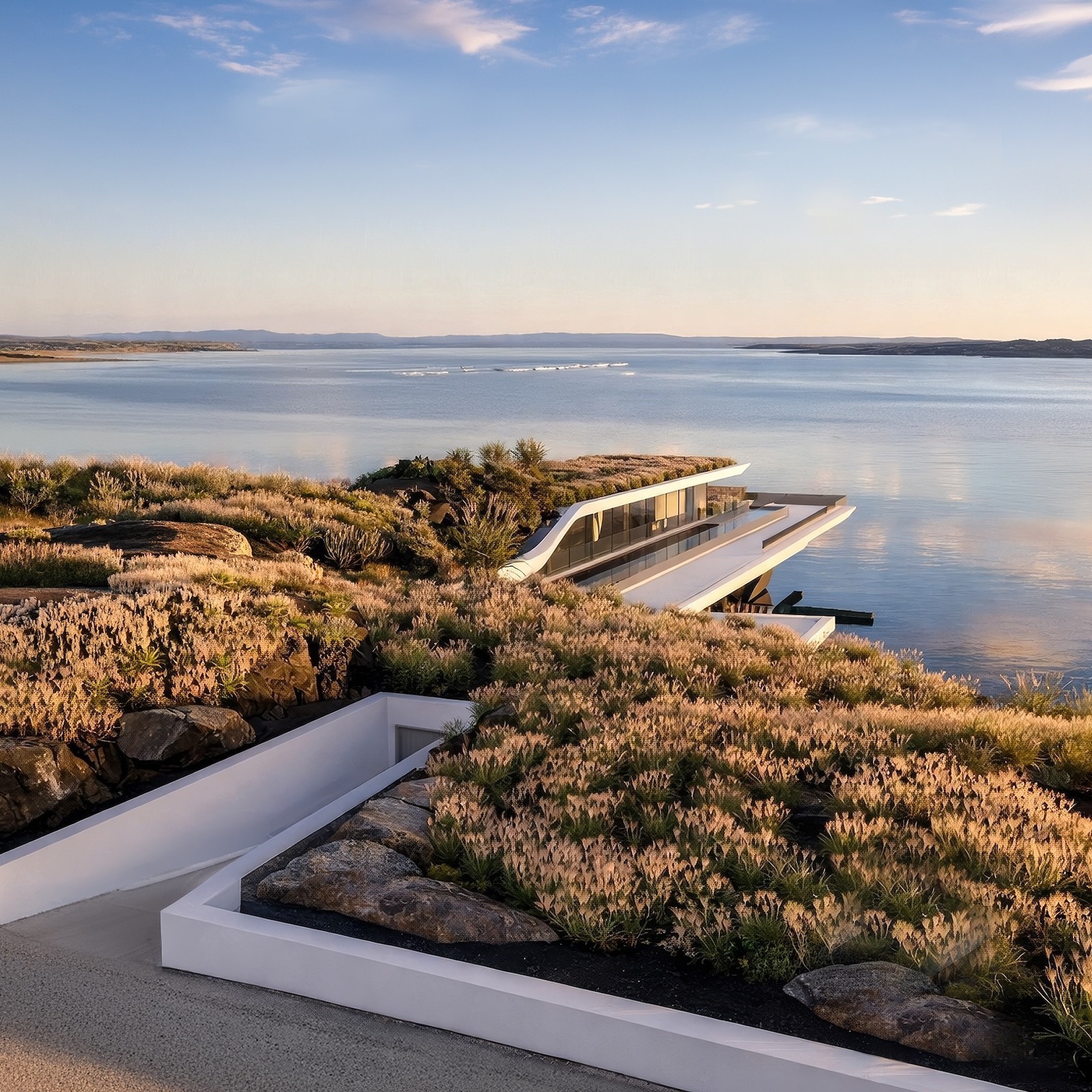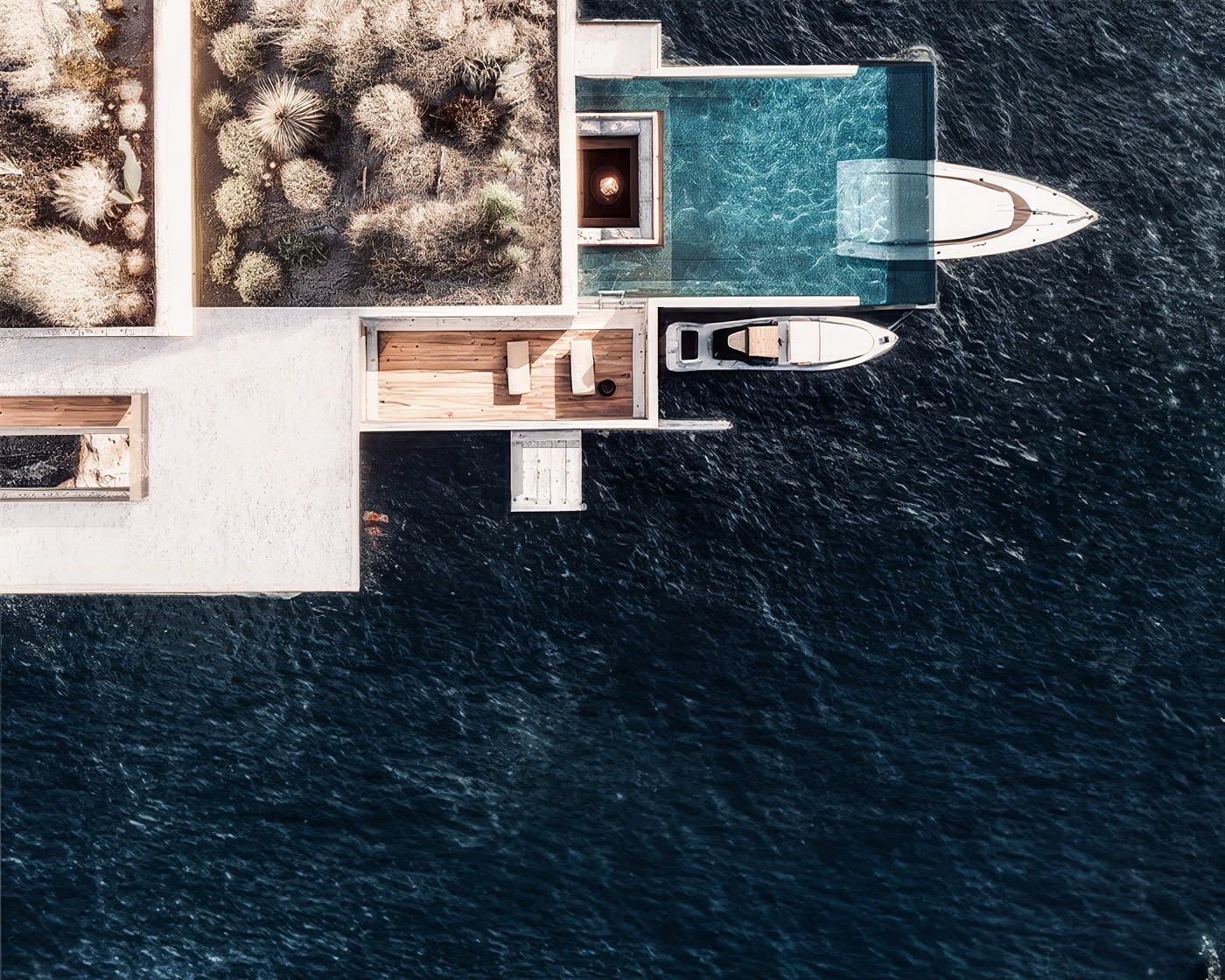 Ένας ιδιωτικός λιμένας «πλέκεται» με την πισίνα, ώστε το νερό να λειτουργεί ως κυκλοφορία. «Δεν βγαίνεις πλέον από το σπίτι για να φτάσεις στη θάλασσα· η άφιξη μπορεί να γίνει με σκάφος», εξηγούν οι αρχιτέκτονες. «Ο ορίζοντας βιώνεται από το εσωτερικό και η ακτογραμμή μετατρέπεται από όριο σε επίπεδο κατοίκησης. Από τη στεριά παραμένει χαμηλών τόνων· από τη θάλασσα μετατρέπεται σε αντικείμενο με έντονη αντίθεση προς το τοπίο, σχεδόν σαν σκάφος. Το ίδιο κτήριο αποκαλύπτεται διαφορετικά ανάλογα με την πλευρά προσέγγισης. Από τη μία σχεδόν εξαφανίζεται, από την άλλη δηλώνει παρουσία», συμπληρώνουν. Η Villa Earth λειτουργεί σαν πυρήνας αναφοράς για το γραφείο.