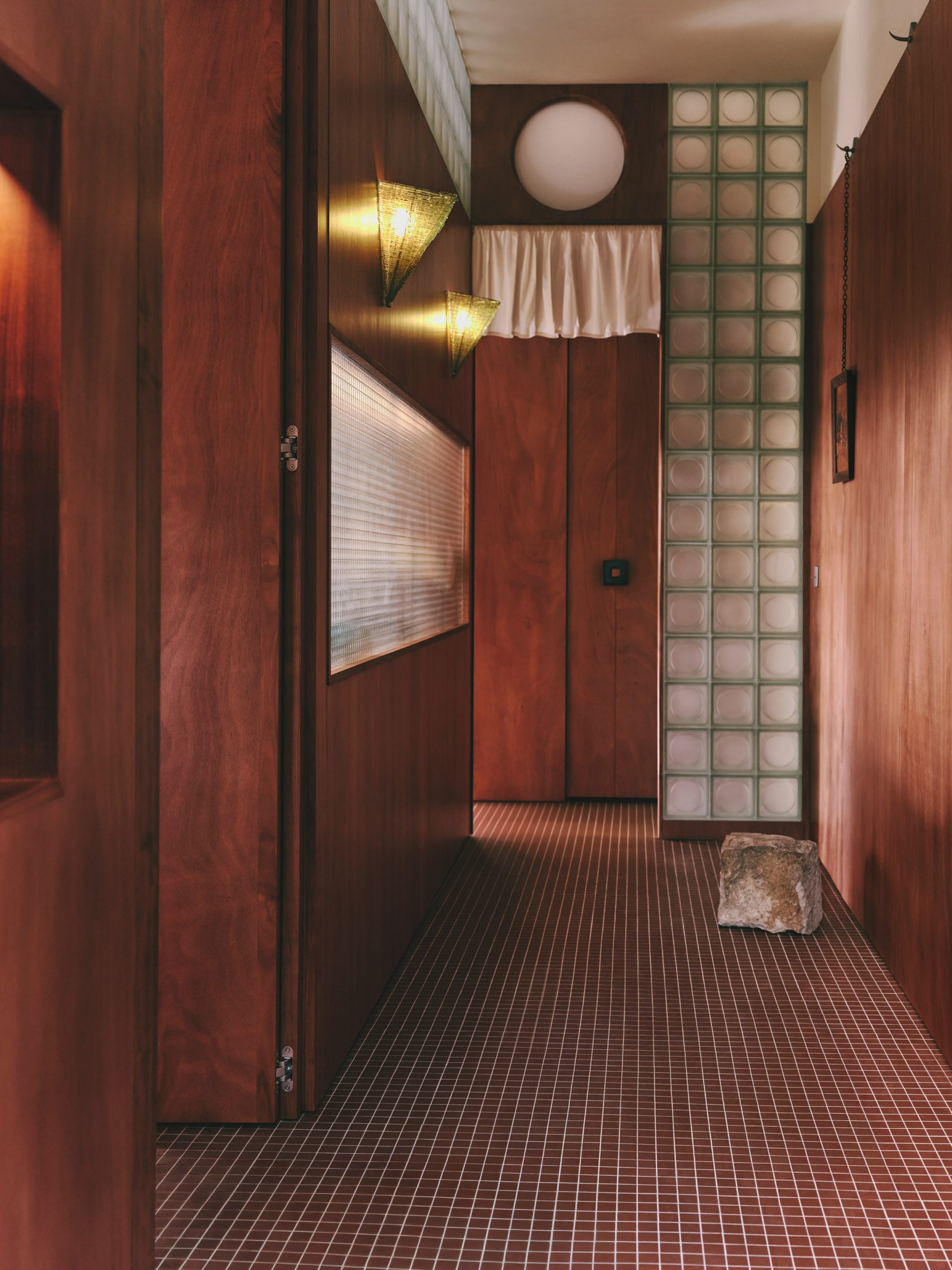 Η επιλογή των υλικών είναι περιορισμένη και σαφής. Το τροπικό ξύλο οκουμέ, βαμμένο σε βαθύ κόκκινο, κυριαρχεί στον εσωτερικό πυρήνα, ενώ το δάπεδο και οι επιφάνειες επενδύονται με κεραμικά πλακίδια σε θερμές καφέ αποχρώσεις, παραπέμποντας στην υλικότητα της τοπικής terracotta. Η χρωματική παλέτα λειτουργεί ως συνδετικός κρίκος ανάμεσα στο παρελθόν του κτηρίου και τη σύγχρονη χρήση του.