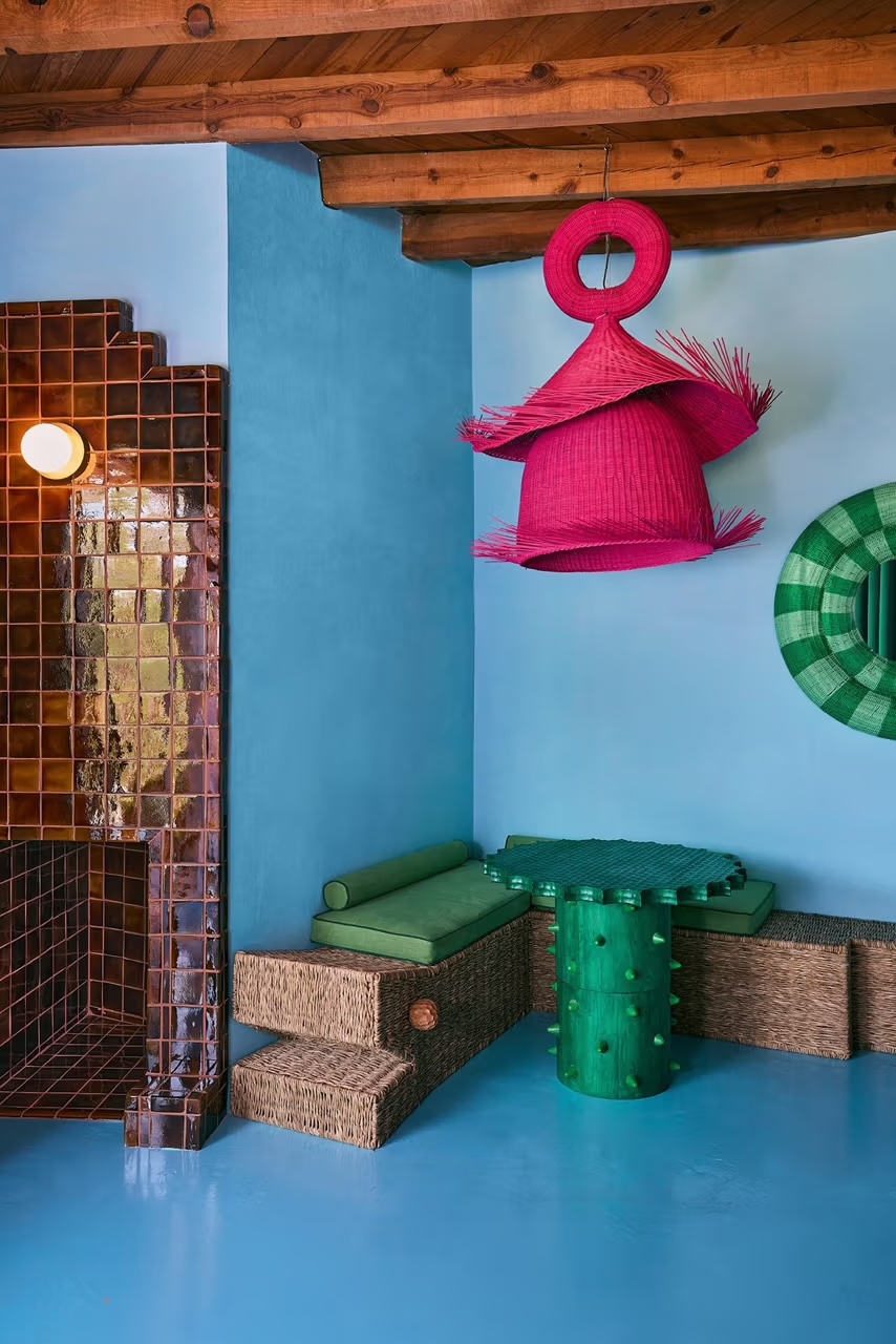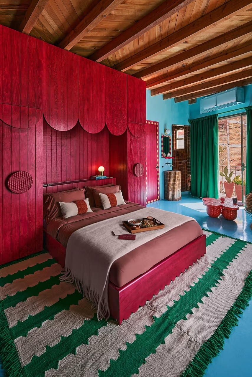Εν προκειμένω, η guest suite έχει λαμπερούς μπλε τοίχους και δάπεδα, μαξιλάρια σε απόλυτο κόκκινο, καθίσματα σε πράσινο kelly και τολμηρές γραμμές σε magenta. Ο ουρανός του χώρου, μια ολόκληρη ξύλινη οροφή με ρουστίκ δοκάρια, σιγοντάρει ήσυχα, κρατώντας ισορροπία. Το αποτέλεσμα είναι ανάλαφρο και ταυτόχρονα βαρυσήμαντο. Χρωματιστό, αλλά ποτέ θορυβώδες. Ζωντανό, αλλά με εσωτερικότητα.
