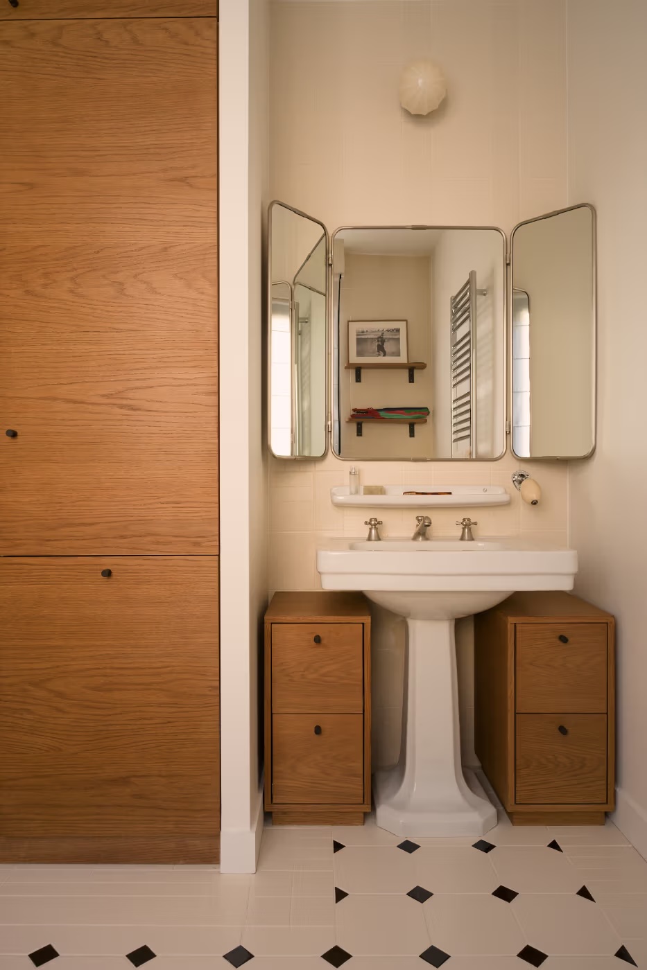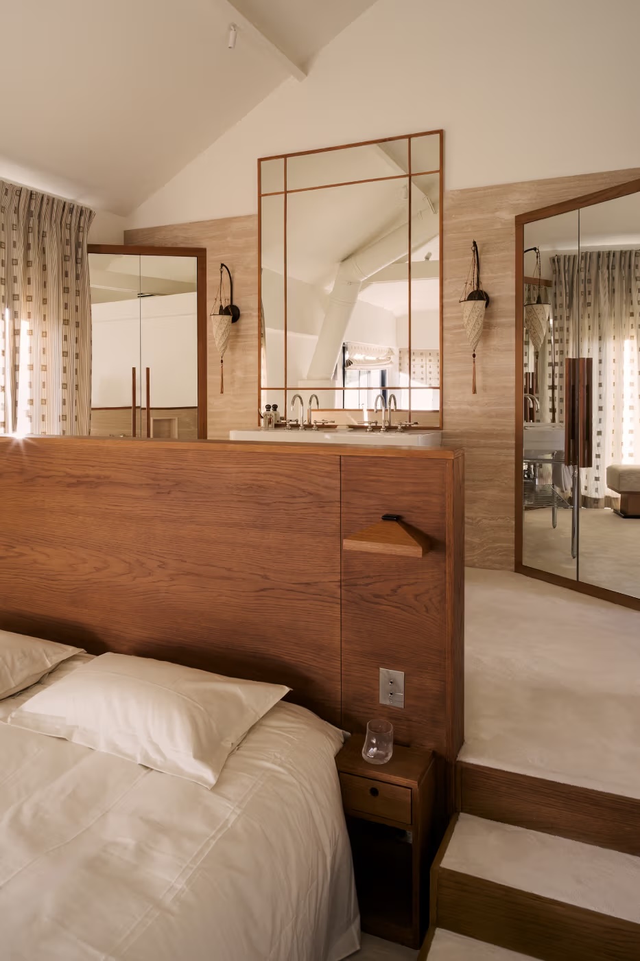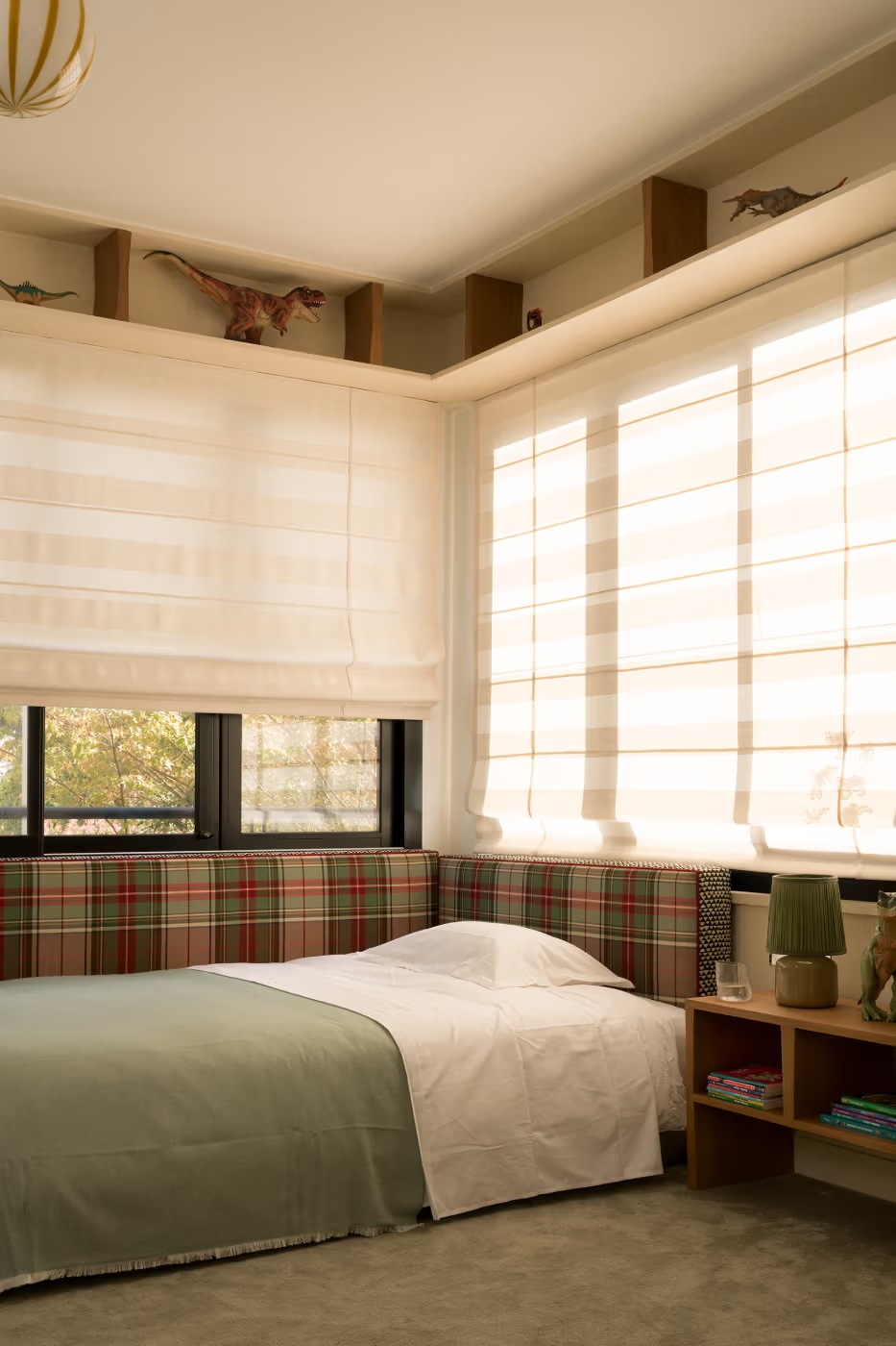 Στον δεύτερο όροφο, το παιδικό δωμάτιο ξεχωρίζει με ένα κεφαλάρι επενδεδυμένο με υφάσματα Ralph Lauren και Elitis, ενώ στον τρίτο όροφο η master suite αναπτύσσεται κάτω από ψηλές θολωτές οροφές, με ένα custom κεφαλάρι από δρυ να κυριαρχεί στο δωμάτιο. Η αίσθηση του ύψους προσδίδει μεγαλοπρέπεια, χωρίς ίχνος υπερβολής.