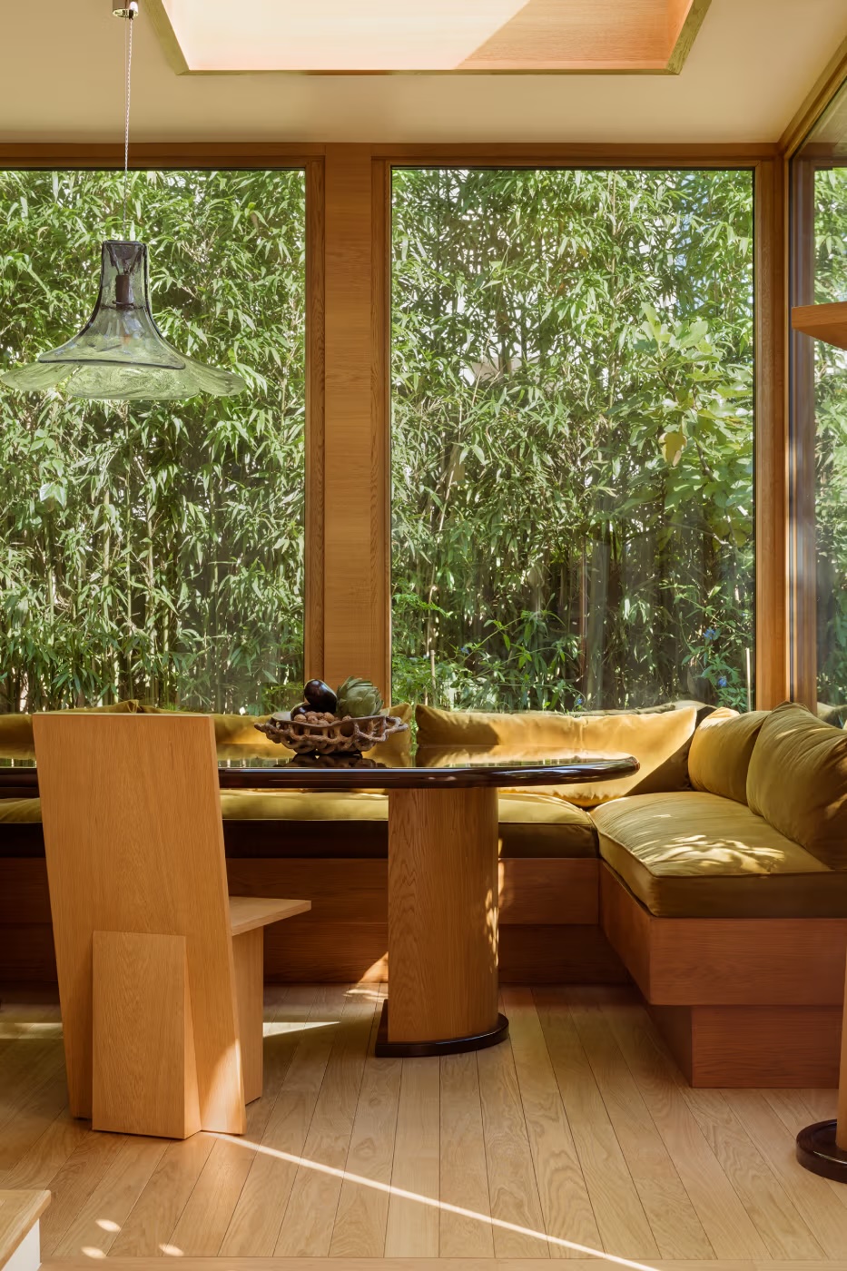 Στο πρώτο επίπεδο, η κουζίνα από δρυ και πράσινο χαλαζία συνομιλεί με μια τραπεζαρία που φιλοξενεί ένα κατά παραγγελία τραπέζι και έναν ενιαίο πάγκο επενδεδυμένο με ύφασμα Dedar. Ο χώρος ανοίγει σε έναν κήπο εμπνευσμένο από την Ιαπωνία, σχεδιασμένο από την Aliénor de Baillencourt, ο οποίος λειτουργεί σαν φυσική προέκταση του εσωτερικού. Η αρχιτεκτονική παύει να έχει σαφή όρια και αφήνει το πράσινο να εισχωρήσει οπτικά στο σπίτι.