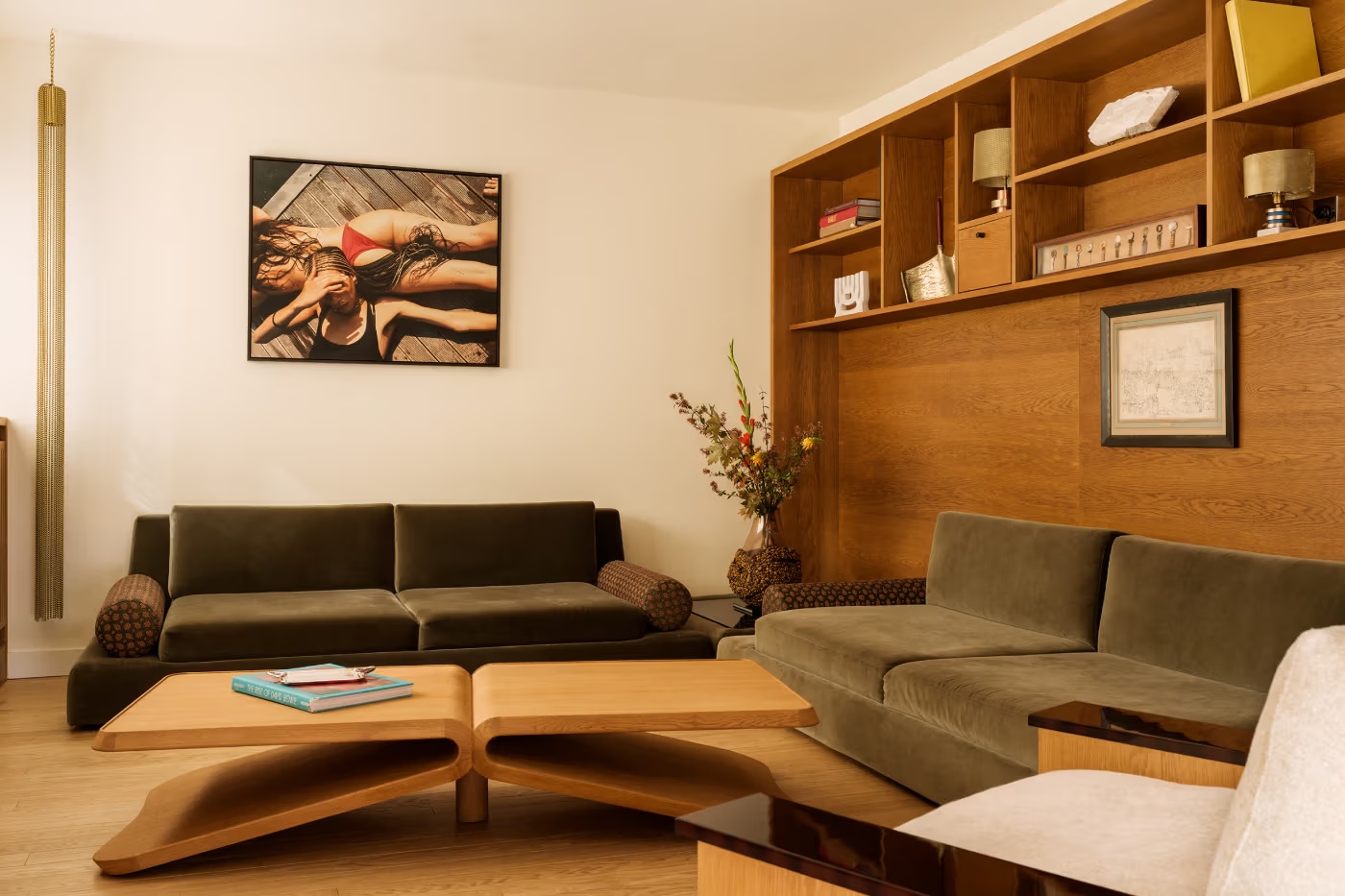 Το εσωτερικό εμπλουτίζεται με επιλεγμένα έργα τέχνης από τη Galerie Gastou και έπιπλα από τη συλλογή Entremets των ίδιων των Hauvette & Madani. Κομμάτια, όπως η πολυθρόνα Colonel, το φωτιστικό δαπέδου Fontainebleau και ο καναπές Podium λειτουργούν όχι ως διακοσμητικά στοιχεία, αλλά ως αρχιτεκτονικές παρεμβάσεις μέσα στον χώρο.