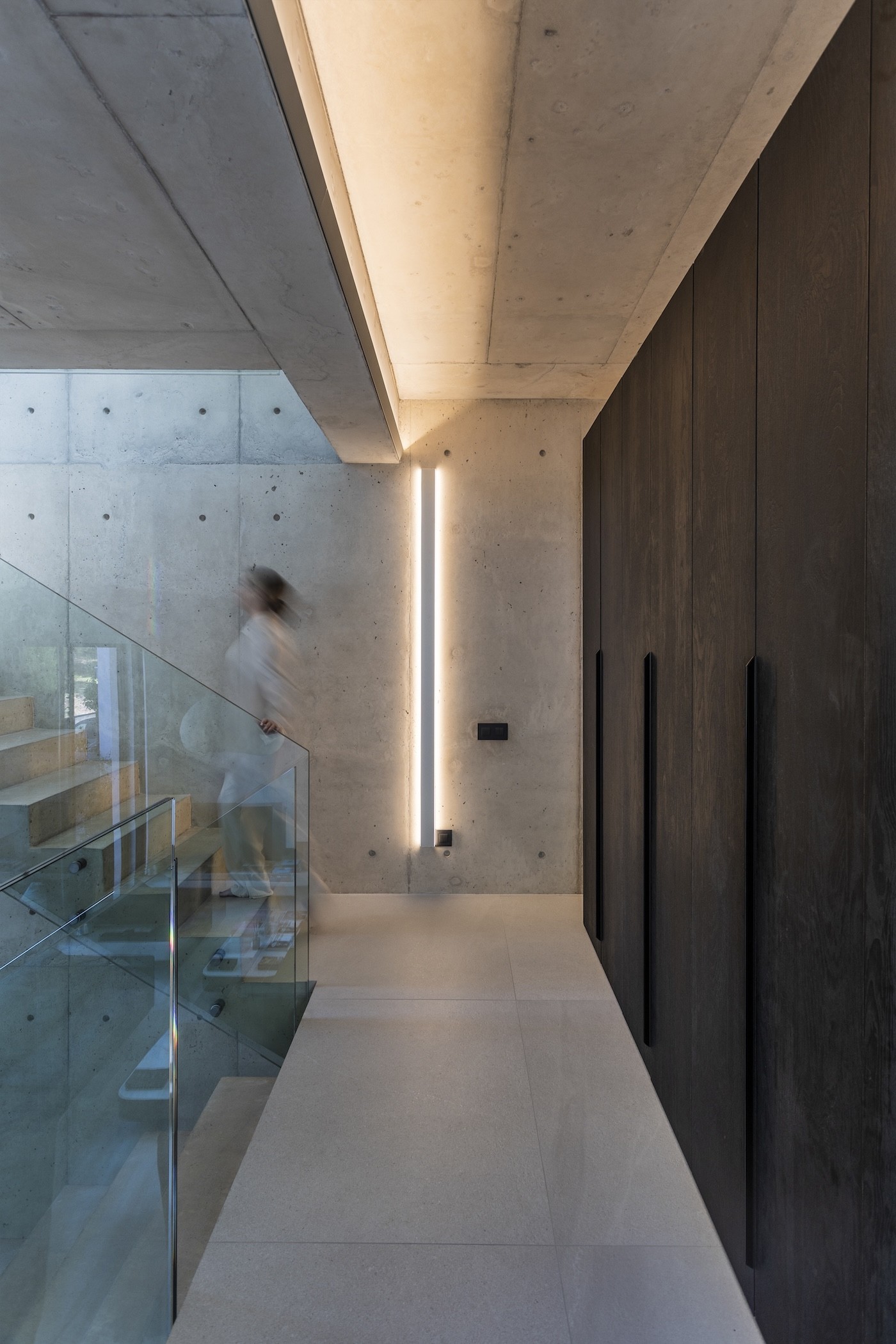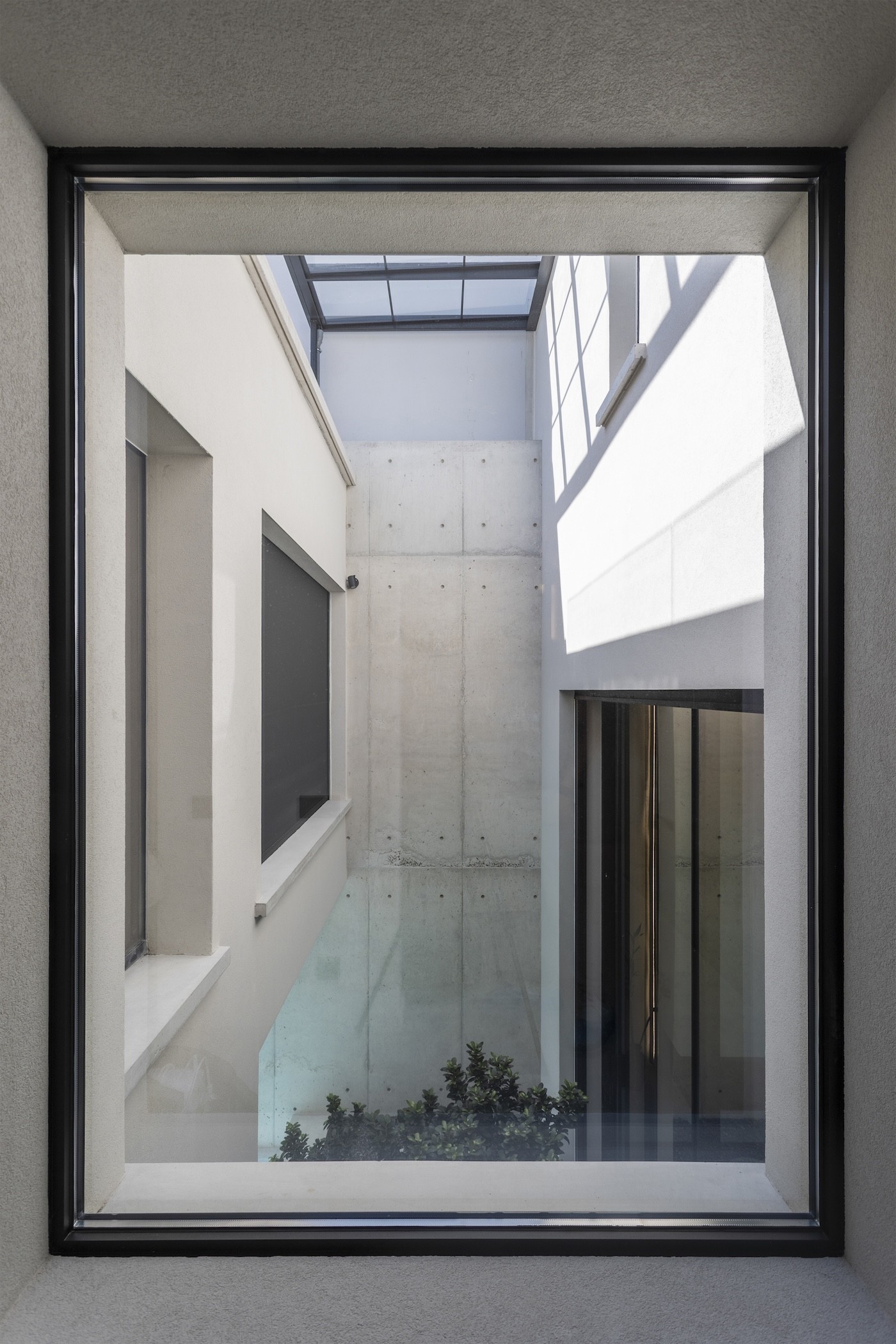 Στο Patio House, ένα από τα κύρια χαρακτηριστικά του σχεδιασμού είναι το εσωτερικό αίθριο, το οποίο ενισχύει το φυσικό φως και δημιουργεί μια αίσθηση διώροφης ευρυχωρίας στο σαλόνι. Το αίθριο λειτουργεί ως σημείο σύνδεσης του εσωτερικού με τον εξωτερικό χώρο. Εδώ, η μικρή πισίνα και η βεράντα που το περιβάλλουν ενισχύουν την αίσθηση της ροής μεταξύ των χώρων. Οι αντανακλάσεις του νερού στους τοίχους από μπετόν προσθέτουν βάθος και υφή στον χώρο, δημιουργώ-ντας ένα παιχνίδι φωτός και σκιών. «Η πισίνα έχει τοποθετηθεί με τέτοιο τρόπο, ώστε το φως και οι αντικατοπτρισμοί του νερού να κάνουν όλες τις επιφάνειες ρευστές. Το καλοκαίρι, το σπίτι γίνεται ένα παιχνίδι διάθλασης του φωτός και του νερού, δημιουργώντας μια μαγική ατμόσφαιρα». Οι υδάτινες αντανακλάσεις και το διάχυτο φως συμβάλλουν σε μια ατμόσφαιρα ηρεμίας, ιδανική για την καθημερινή ζωή.