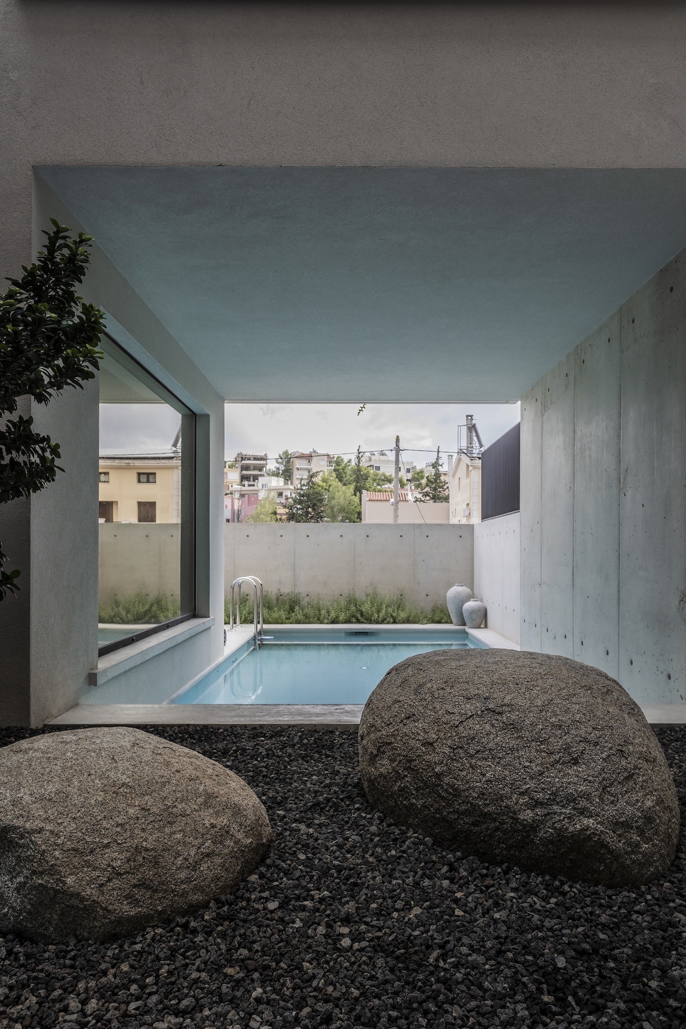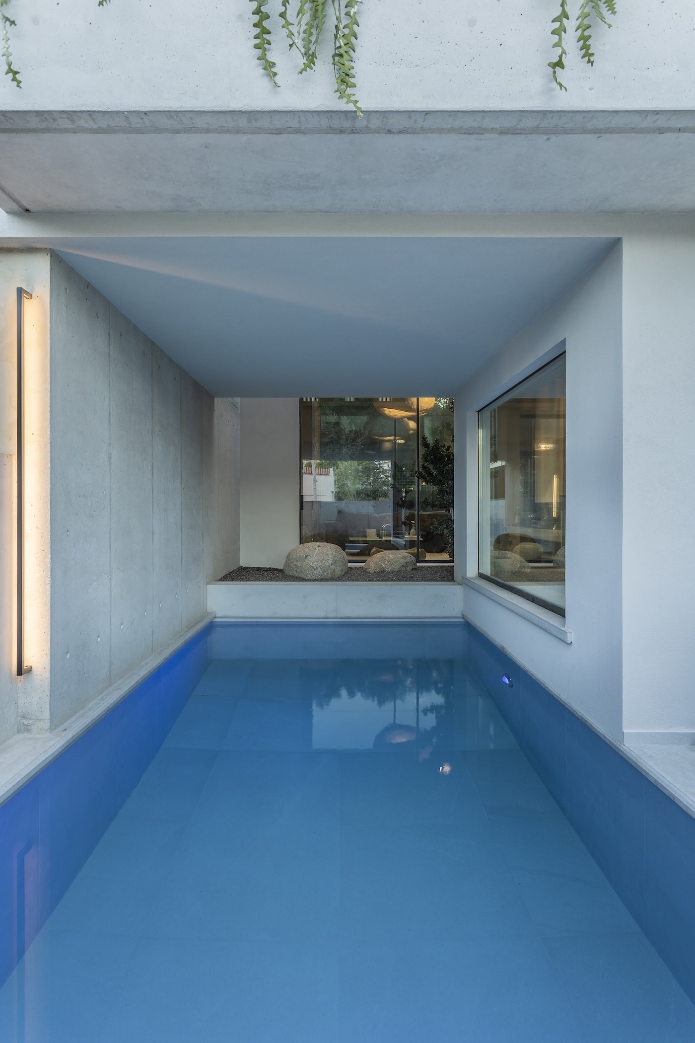 «Συχνά στις μονοκατοικίες υπάρχει ζήτηση για πισίνα, μικρότερη ή μεγαλύτερη. Όταν αυτό συμβαίνει, για εμάς η πισίνα δεν αποτελεί μια απλή παράθεση μέσα στο οικόπεδο, κοντά στο καθιστικό. Τη χειριζόμαστε ως έναν ακόμη χώρο, που συμπλέκεται οργανικά με το εσωτερικό της κατοικίας και εντάσσεται σε ένα περιβαλλοντικό αφήγημα το οποίο συμβάλλει θετικά στο μικροκλίμα και στον τρόπο ζωής των κατοίκων», λέει η Αλεξάνδρα Δαλιάνη.