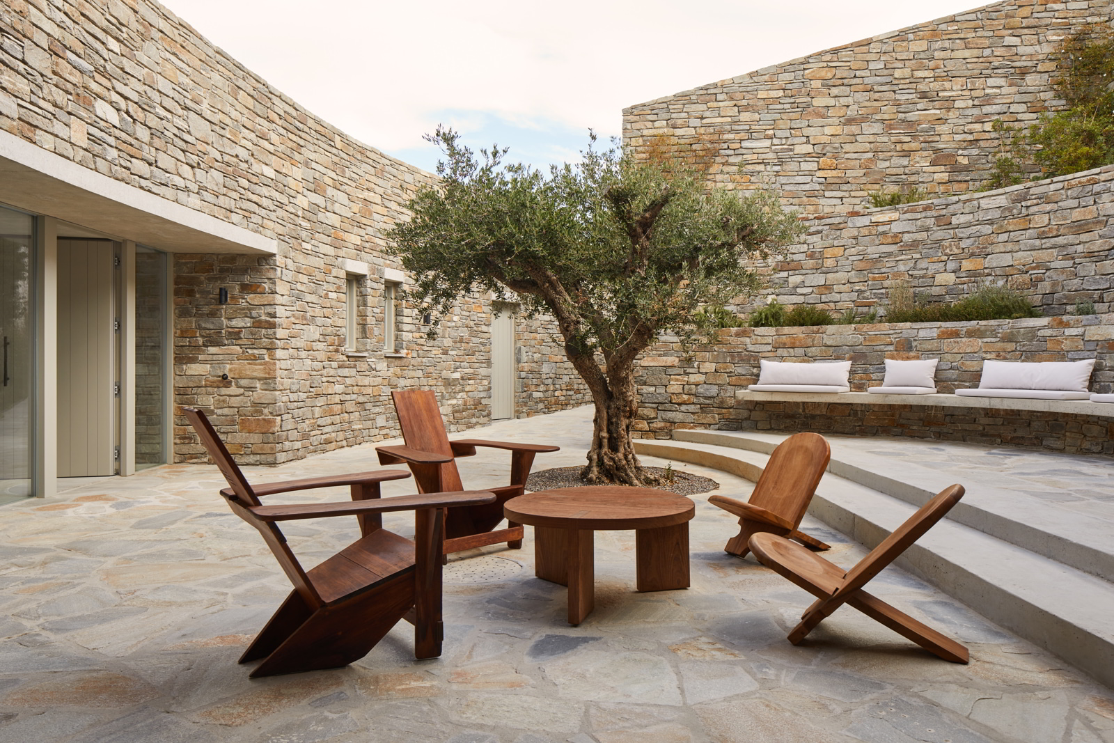 Προστατευμένοι κάτω από τα δοκάρια της πέργκολας, οι κύριοι χώροι διημέρευσης καταλαμβάνουν το χώρο ανάμεσα σε μια διασπορά μονολιθικών όγκων. Η γλυπτική ποιότητα των συμπαγών αυτών τοίχων, οργανωμένων σε μια παιγνιώδη γεωμετρική σύνθεση, φέρνει στο νου την ανεξάντλητη πλαστικότητα της λαϊκής κυκλαδίτικης αρχιτεκτονικής.