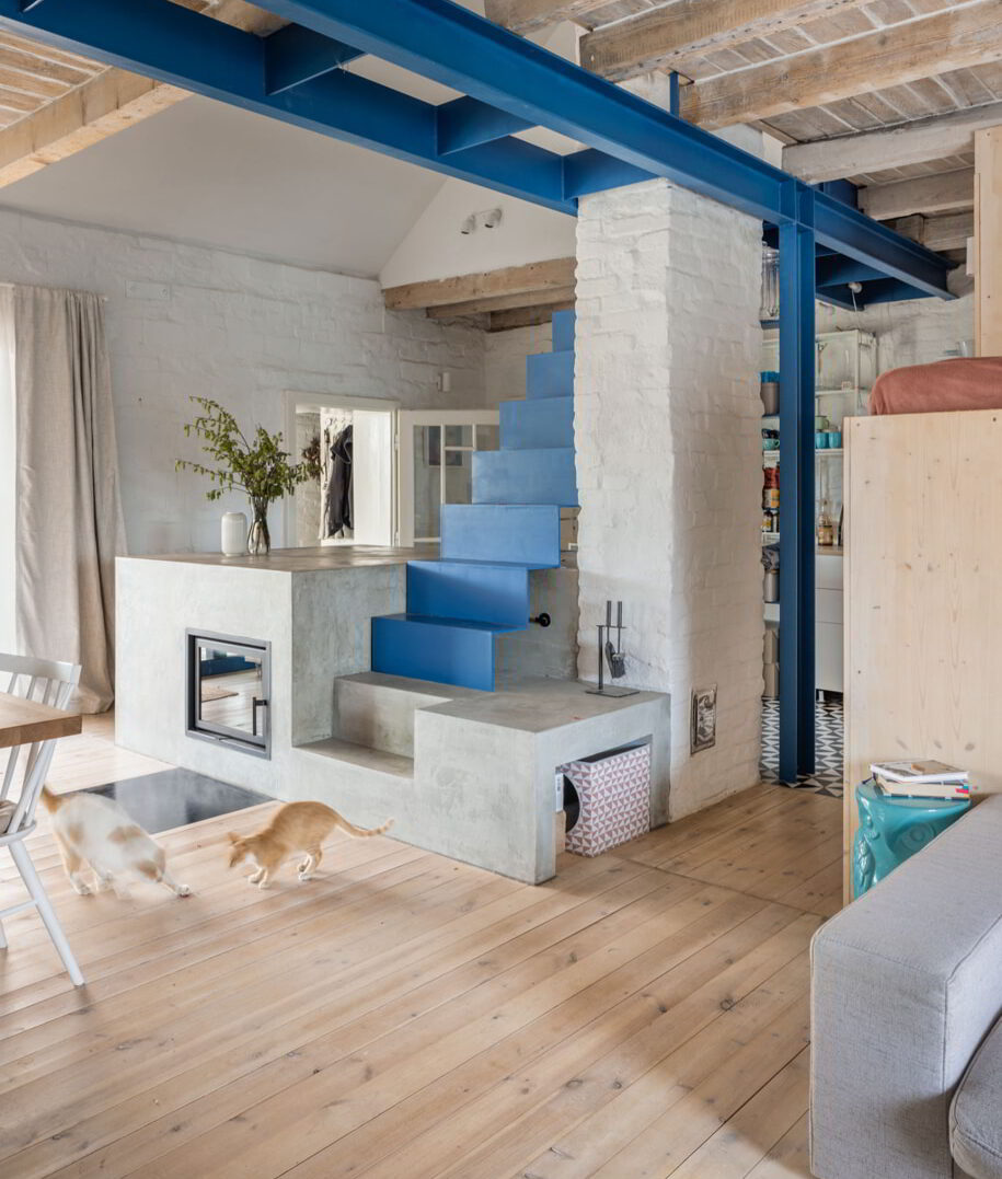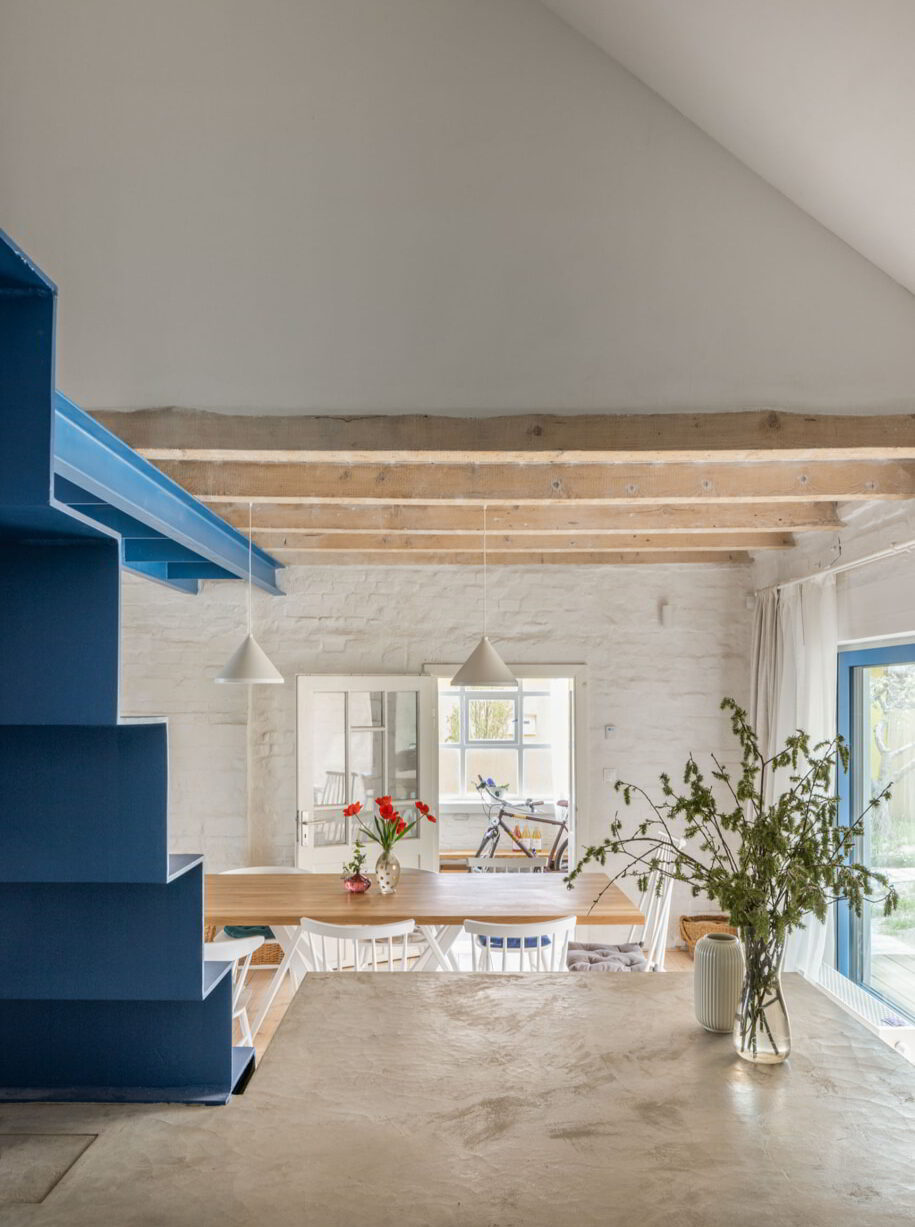 Εξ ου και το μεγάλο τραπέζι, η παραδοσιακή σόμπα με χώρο για χαλάρωση, οι σκάλες που οδηγούν στις κουκέτες και η κουζίνα στη γωνία. Η κουκέτα κάτω από την οροφή, αλλά ακριβώς πάνω από το τραπέζι κρίθηκε ιδανική για συνομιλίες και συζητήσεις μετά το δείπνο. Οι επισκέπτες θα μπορούν να παρακολουθήσουν ταινίες στον καναπέ ή στην εσοχή ακριβώς πίσω. Ενώ μεγάλες διπλές πόρτες δημιουργούν έναν διάλογο με τον εξωτερικό χώρο που πλαισιώνεται από μια πέργκολα. Εντωμεταξύ, το master bedroom βρίσκεται στην αρχική επέκταση.
