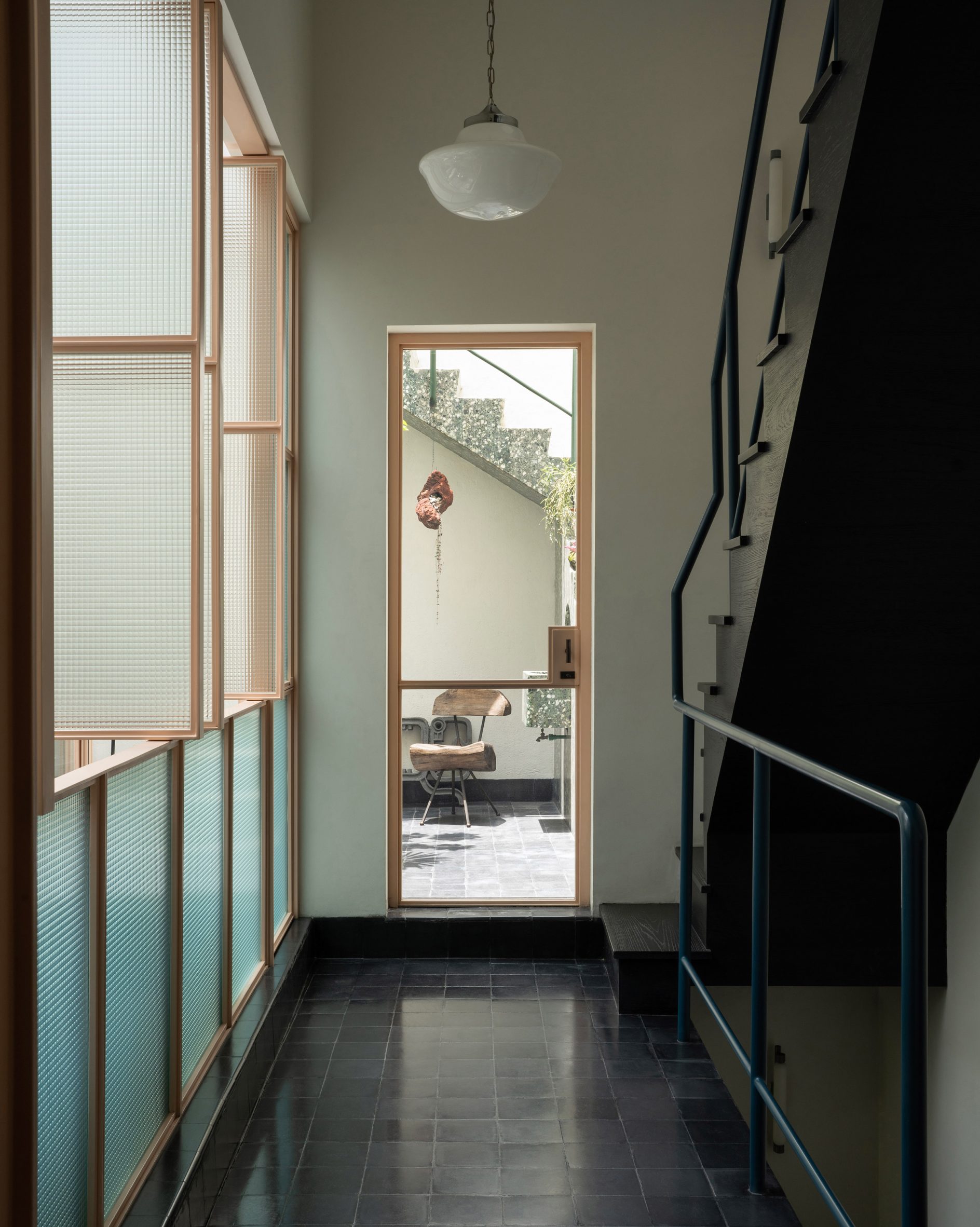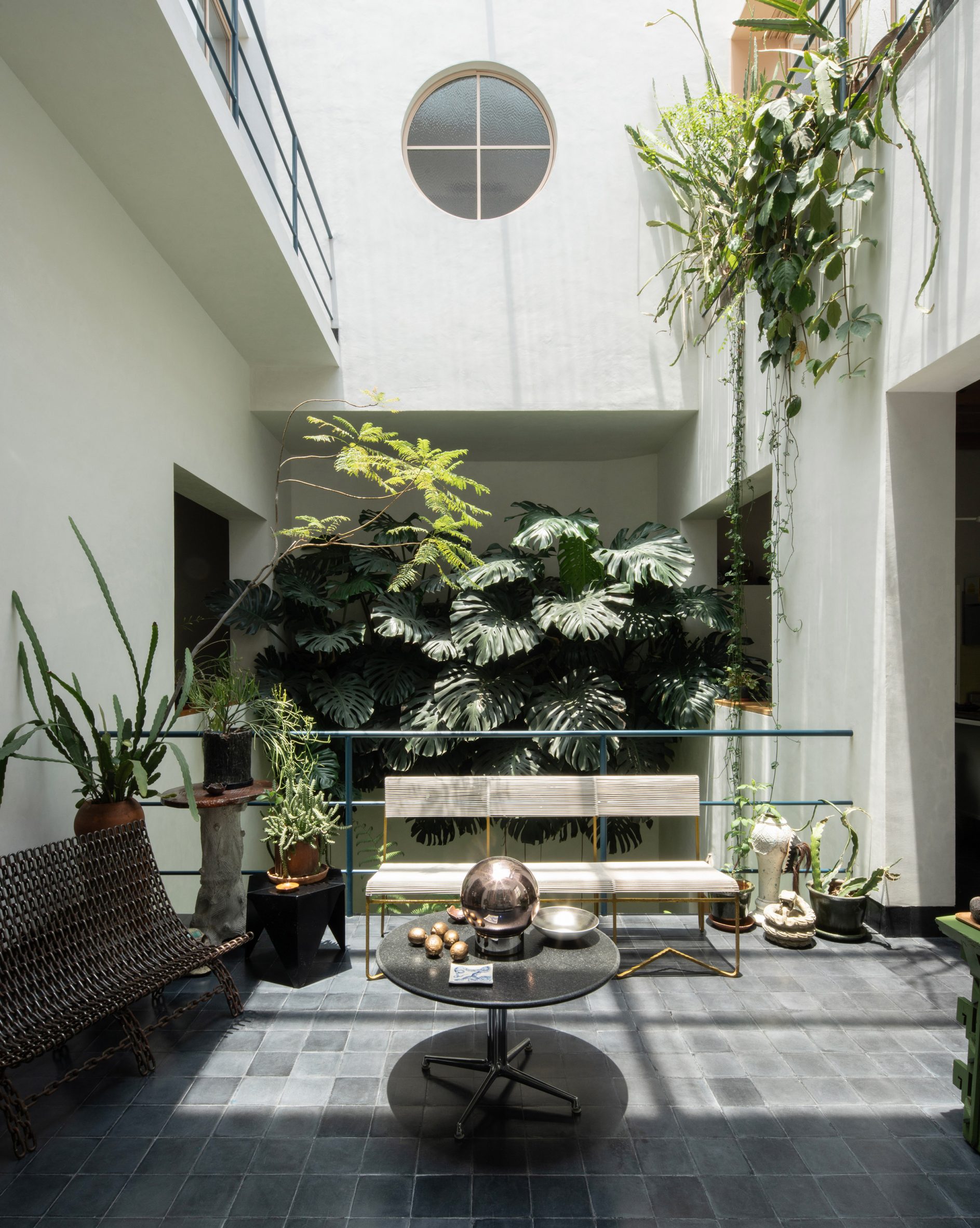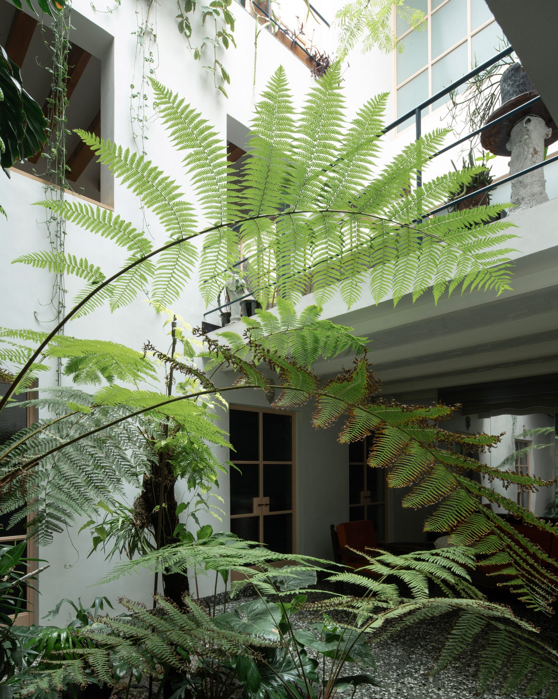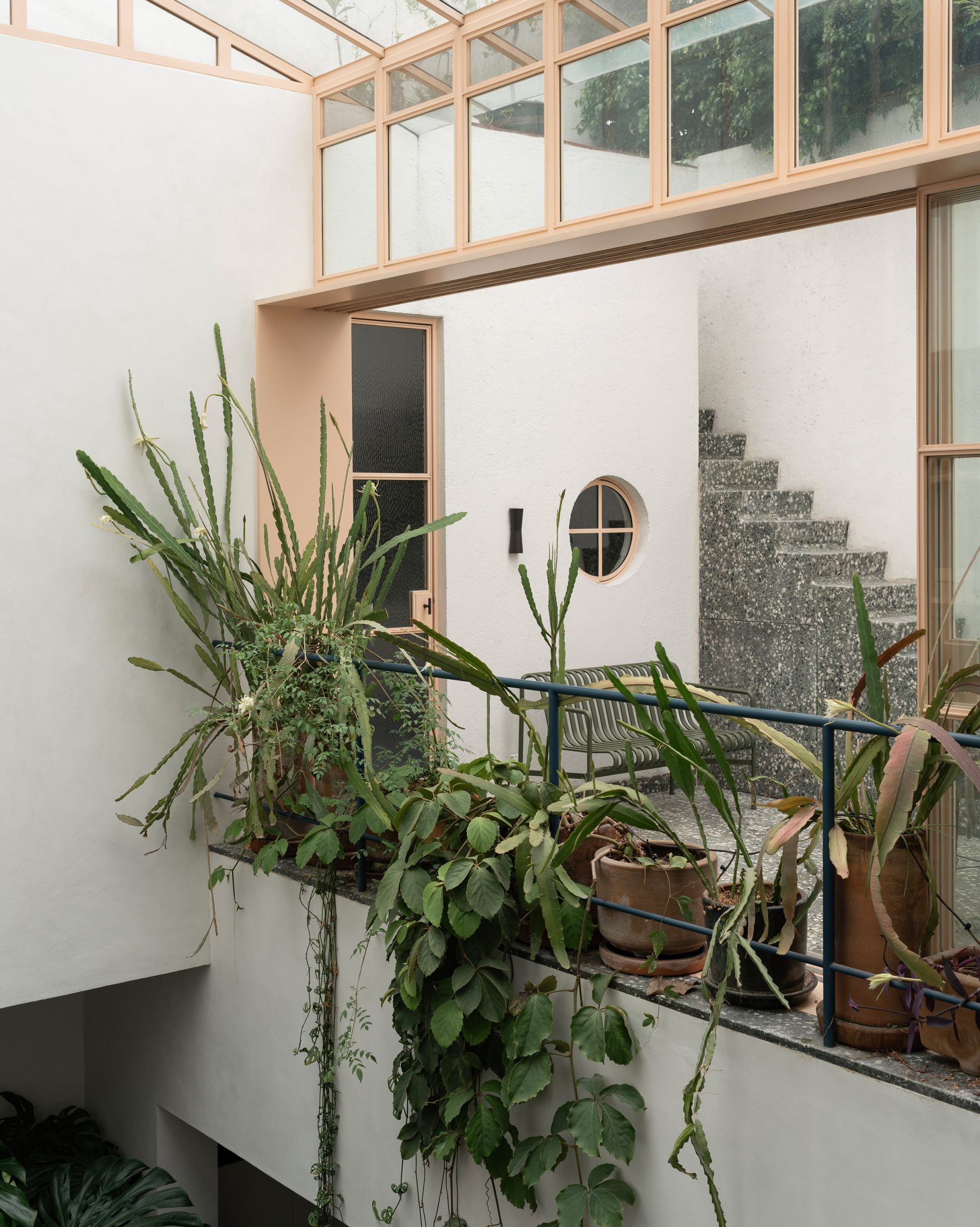 Η μεταλλική λεπτομέρεια παίζει πρωταγωνιστικό ρόλο. Κάγκελα, σκάλες και φεγγίτες έχουν βαφτεί σε απαλές, πουδρέ αποχρώσεις, σε μια σαφή αναφορά στις χρωματικές θεωρίες του Le Corbusier. Στο ισόγειο, ένα πράσινο terrazzo περιβάλλει τον κεντρικό χώρο φύτευσης, με τροπικά φυτά να αναπτύσσονται τόσο στο έδαφος όσο και σε επιτοίχιες ζαρντινιέρες που ανεβαίνουν προς τα πάνω επίπεδα.
