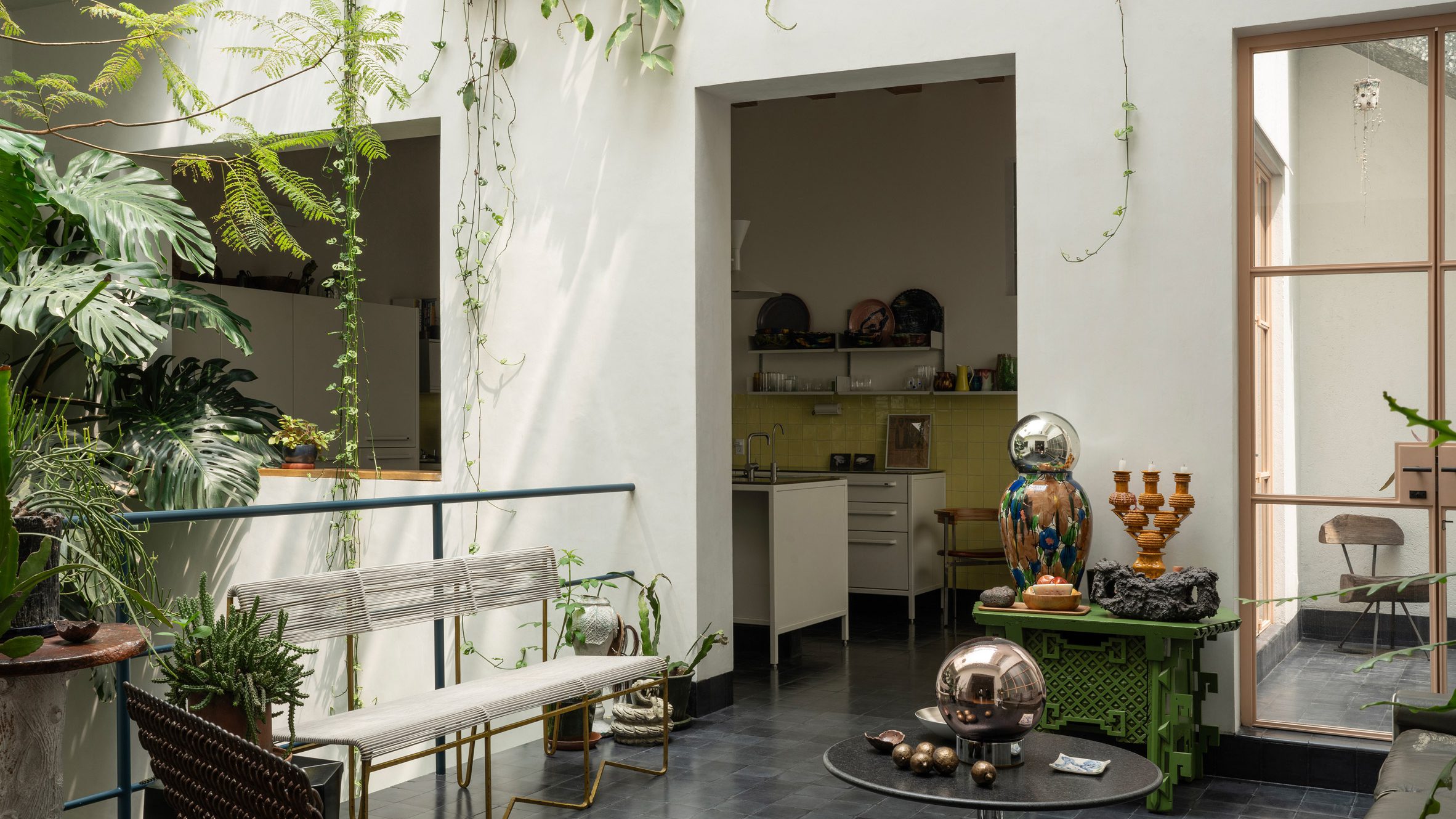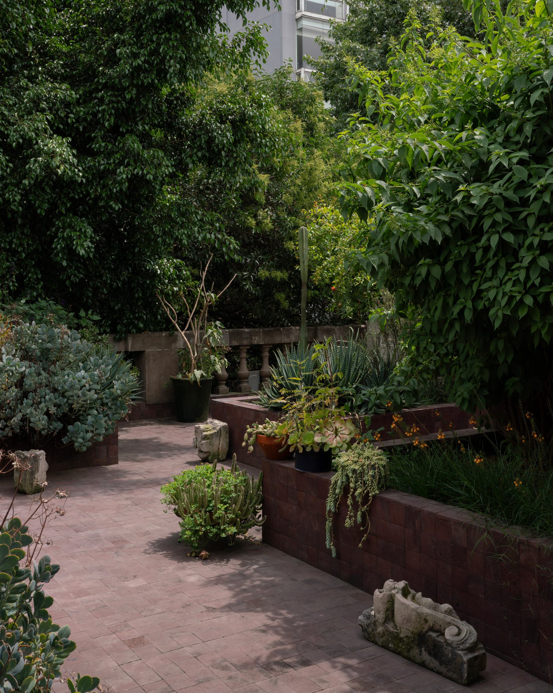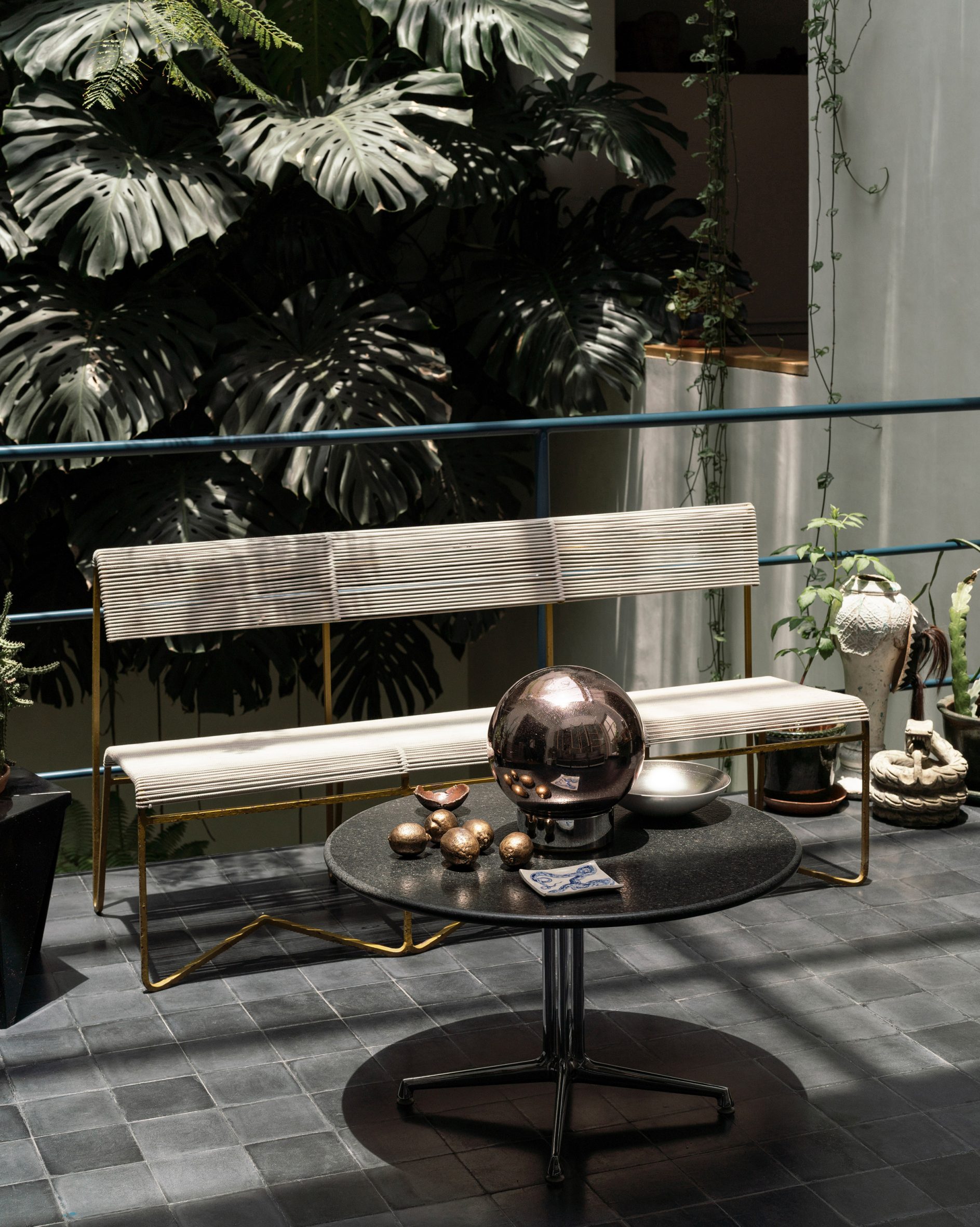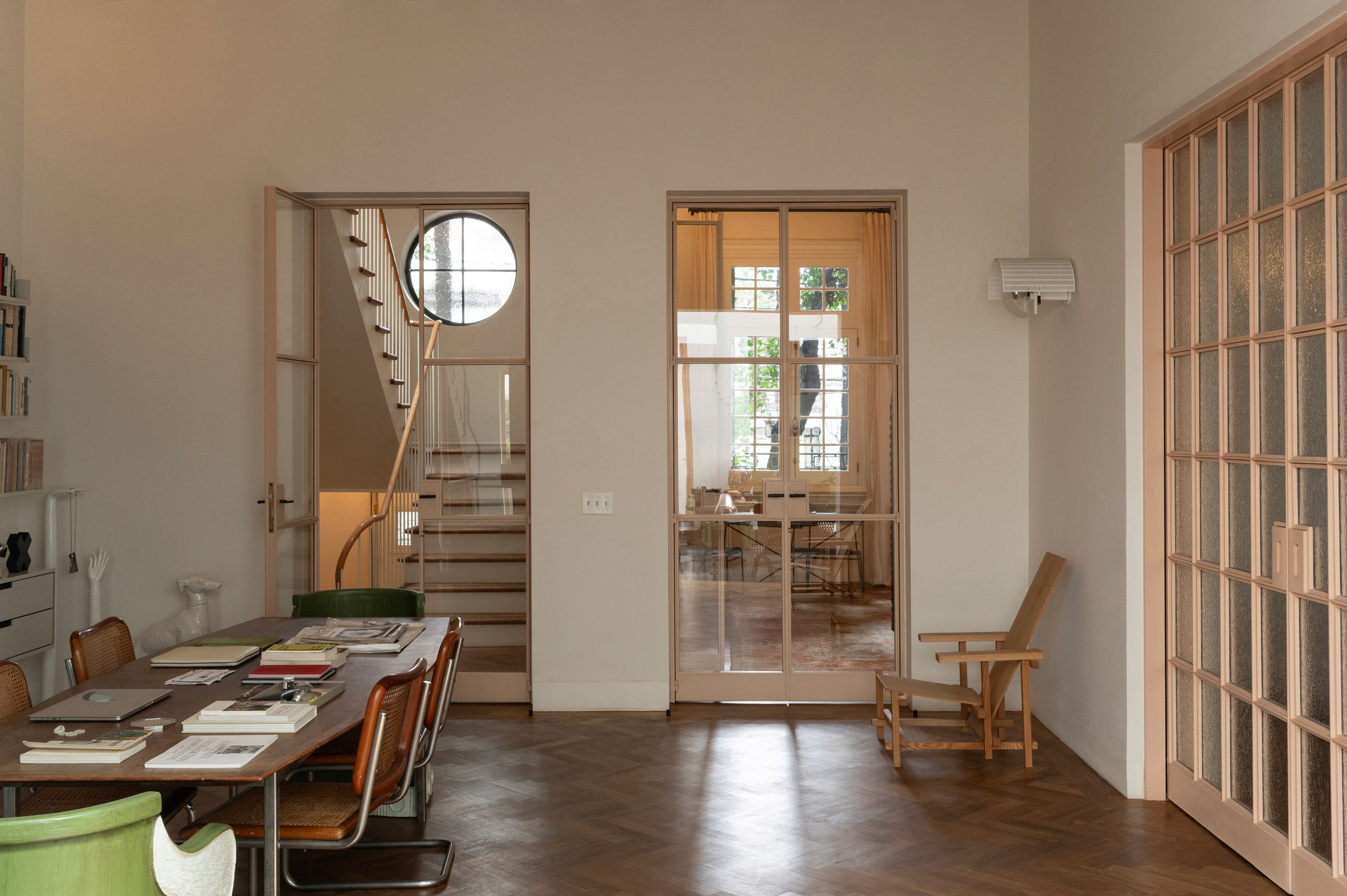 Η μεταλλική λεπτομέρεια παίζει πρωταγωνιστικό ρόλο. Κάγκελα, σκάλες και φεγγίτες έχουν βαφτεί σε απαλές, πουδρέ αποχρώσεις, σε μια σαφή αναφορά στις χρωματικές θεωρίες του Le Corbusier. Στο ισόγειο, ένα πράσινο terrazzo περιβάλλει τον κεντρικό χώρο φύτευσης, με τροπικά φυτά να αναπτύσσονται τόσο στο έδαφος όσο και σε επιτοίχιες ζαρντινιέρες που ανεβαίνουν προς τα πάνω επίπεδα.